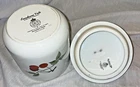 Royal Worcester EVESHAM VALE Small Canister w Fruit Finial on Lid 7” Tall. Dated 1986. This small round canister from Royal Worcester's Evesham Vale product line is a delightful addition to any kitchen. With a colorful fruit finial on the lid, it adds a touch of cheer to your countertop. The canister is made of high-quality ceramic and has a single compartment for storing dry goods. The printed backstamp indicates its authenticity as a genuine Royal Worcester piece. On the inside of the lid, it reads "Freezer to Oven- Oven to Table, Microwave proof. Beautiful condition. See pictures. Buyer to pay for shipping. Payment to be made with in 3 days of auction close. Smoke free home.