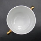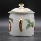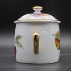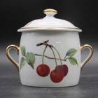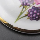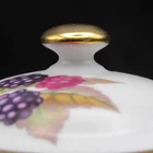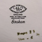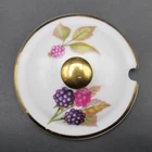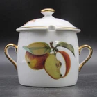 For sale is a marmalade or jam jar by Royal Worcester in the Evesham Gold pattern. The small jar features two handles in gold on the dish decorated with botanical style cherries on one side and apples, one with slice removed, opposite. The slightly oversized lid has a gold mushroom-shape handle, gold trim around rim and small spoon slot. The lid is decorated with blackberries as they ripen. Both pieces are in very good condition with no damage. Gentle wear includes a small dot of missing gold on lid (photograph 16). The dish is marked in black on the bottom including pattern name. Approximate Measurements Jar 2 3 /4" diameter top 4 3/8" wide, including handles 2 5/8" high 7 fluid ounce capacity Lid 3 1/4" diameter 1 1/4" high 3 7/8" combined height