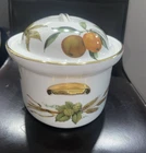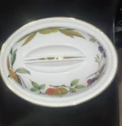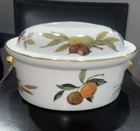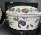 This beautiful covered dish by Royal Worcester is a must-have for any collector of art pottery. The oval shape and gold trim make it a stunning piece that is sure to impress. With one compartment and a glossy finish, this dish is perfect for serving up your favorite casserole or hot dish. Crafted in England and made of high-quality porcelain, this original piece from the Royal Worcester Evesham collection is a true gem. The lid adds an extra touch of elegance and the production technique of pottery adds to the unique charm of the dish. Add this exquisite piece to your collection today! SIZE: L 10" X 7 1/2" X 4 1/4"