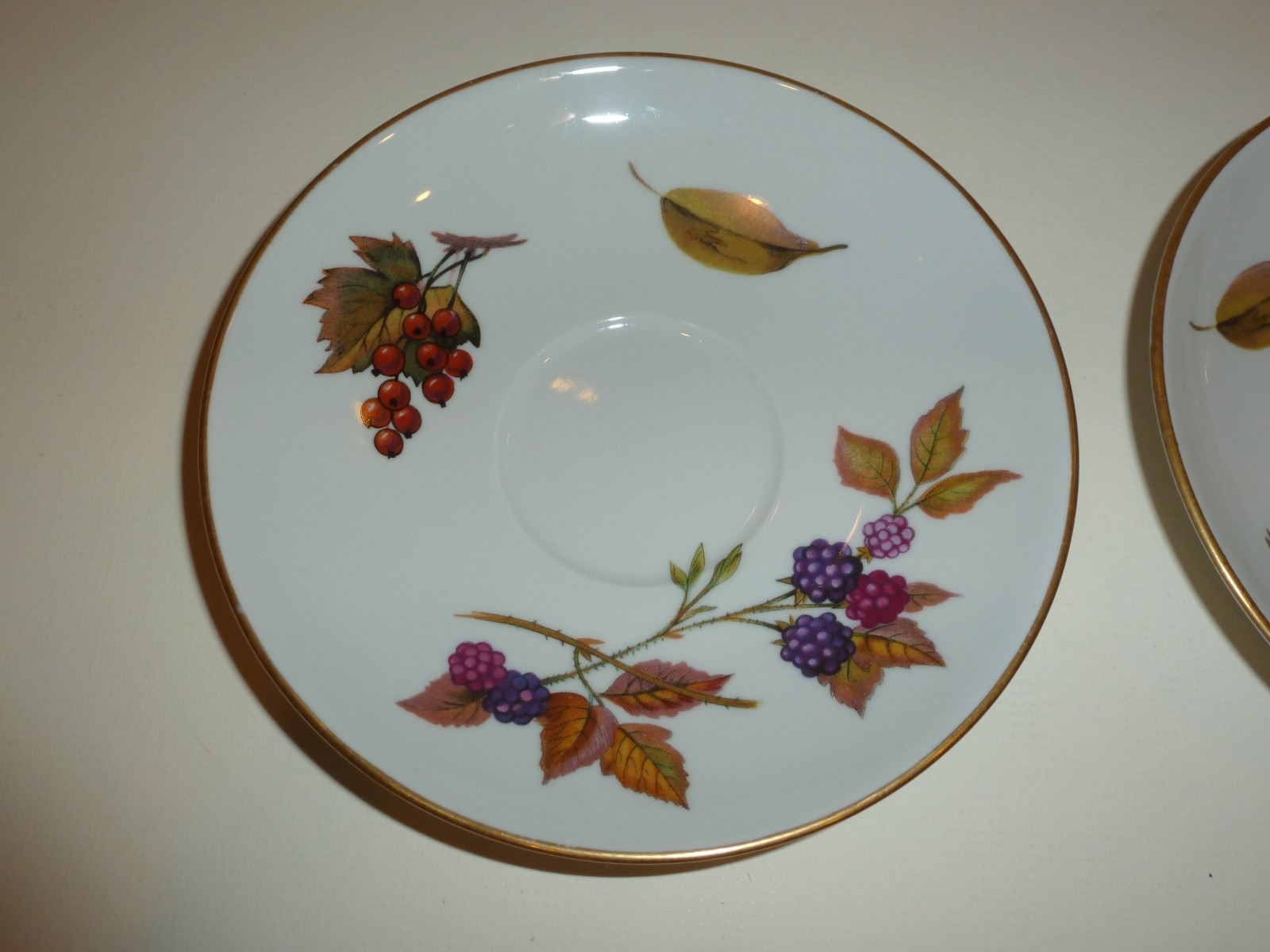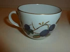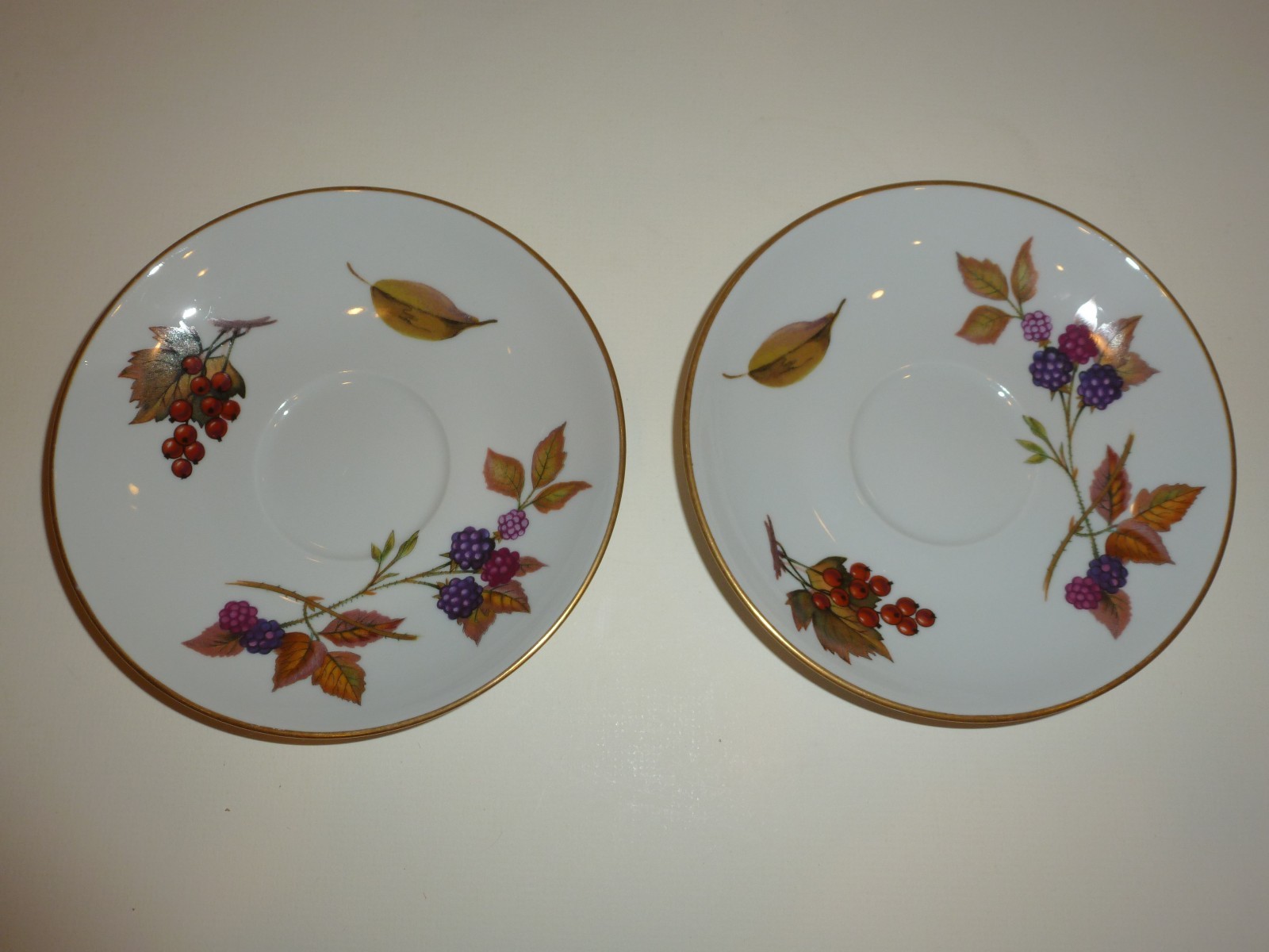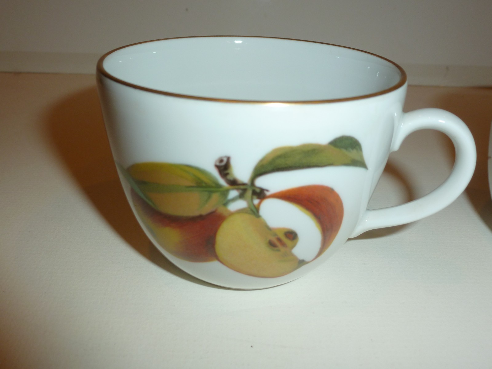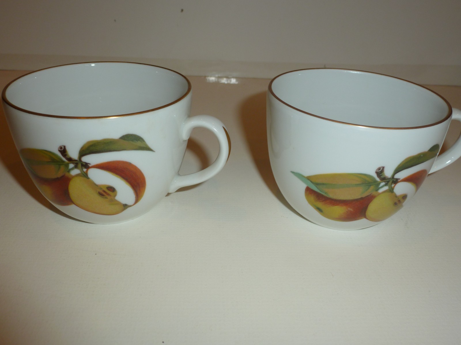 Royal Worcester Evesham pair of cups and matching saucers feature designs of fruits and berries, with gold tone rims. Each cup measures 2-1/2" tall x 3-1/2" diameter at top. Each saucer measures 6" diameter. These are used pieces and show visible signs of wear and use. No chips or cracks, but visible scuff marks and scratches/utensil marks inside and out, top and bottom, consistent with moderate use and handling. Visible scuffing to bottom side bottom ring rims. Please feel free to ask us any questions you like before you bid or buy. We're happy to respond based on what we know and can observe. Kindly send any questions our way well before the listing ends so we have time to respond to you. About Us We have been successful eBay sellers for many years and look forward to your continued business. Payment, Packing and Shipping Payment is via PayPal only, and we require payment within three days of purchase. We use reclaimed boxes and packing materials, in addition to new materials, when securely packing. This is a small step toward environmental friendliness. We take great care in packing items to ensure they arrive to you intact. We will combine shipping on multiple purchases to the same address, to the extent that the items can be shipped safely and securely in one package. If you purchase multiple items from us, kindly wait for an invoice from us before making payment so we can calculate your combined shipping discount. At this time, we are unable to ship internationally. Returns: Because of the fragile nature of most of our items, we do not accept returns as a general rule. If you receive an item and it is not what you expected, please contact us through eBay Messages so we can correct the situation. Please do contact us via eBay Messages with questions, comments, and inquiries about orders. We check our messages frequently throughout the day and usually respond within a few hours.