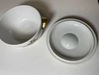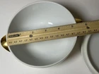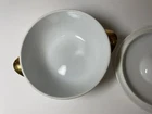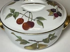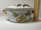 Featured here is a 1.5 pint covered casserole dish in the Evesham Gold pattern from Royal Worcester. Made in England, this pattern has realistic fruits all across a bright white porcelain, accented with gold highlights along the rims. Included here is the 1.5 pint covered casserole dish which has the flat handle and is decorated with cherries, pears, blackberries, currants, plums, and peaches. In good condition, some very light wear to gold, see pictures for closer detail. Measures 5.5" wide at rim, 6.75" wide with handles, 3.5" tall, and weighs 1 lb 6 oz prior to packaging. Please message us with any questions! We love to hear from you and typically answer within minutes from 10 a.m. to 10 p.m. ET. We have other great vintage finds available and happily combine shipping for discounts! Just click the link to our store to view our items. New items added daily. Thanks for stopping, and enjoy shopping!