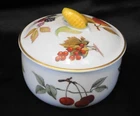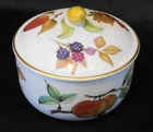 ROYAL WORCESTER :Evesham Gold BUTTER TUB - ENGLAND Evesham GoldDescription: Porcelain, Various Fruits, Gold TrimPattern: Evesham Gold by Royal Worcester Status: Discontinued. Circa: 1961 - 2015 Evesham Gold by Royal Worcester features assorted fruit still-life designs that look virtually lifelike. These designs are beautifully contrasted against a luminescent white background and striking gold trim - the result is an eye-catching pattern that's sure to draw compliments from every guest.. Product Information Diameter: 4 1/2 in Height: 2 1/2 in, With Lid on: 4 in Porcelain, Bone Made In England Hand Wash Piece Code: C1M8 Condition: Used Like New ( please see the picture of the item)
