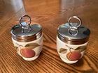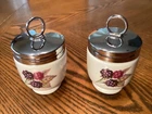 This beautiful quiche dish from Royal Worcester's Evesham collection is a vintage piece, made in England in 1961. The round ceramic dish features a stunning fruit pattern in gold and is perfect for baking your favorite quiche. The dish is part of a 9-piece matching set includes 2 egg coddlers with 2 lids & 2 chocolate pots with 2 lids. The quiche dish is both oven-safe and decorative, making it a great addition to any kitchen. It has a glossy finish and is printed with the Evesham backstamp. This mid-century modern piece is a great conversation starter and is sure to impress your guests. Hand wash only. Quiche dish Dia 7.75”, Ht 1”, Wt 15 oz 2 Egg Coddlers each Dia 2” Ht 3.5” Wt 5.4oz 2 Chocolate pots each 2.5” Ht 3.5” Wt 5.3oz