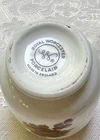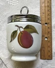 Lovely large porcelain bone china egg coddler by Royal Worcester of England. This Evesham Gold pattern was crafted in England. This pattern on this piece features a peach on one side and a cluster of currents on the other side. It has a white porcelain, bone china body and a metal screw top with a ring. This double sized egg coddler comes with a booklet of fun-to-try recipes. Egg coddlers are simply porcelain or glass containers that allow the egg to be soft cooked without being placed directly into the water. Coddled eggs are cooked in a water bath out of it's shell in a porcelain coddler or ramekin. The most iconic British coddlers are made by Royal Worcester . This coddler is in very fine pre-owned condition.