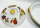 This is such a popular pattern by Royal Worcester of England. Manufactured from 1961-2015 it is called Evesham Gold and features various fruits with gold trim. This is a small round entree dish with lid and has a gold knob handle on the lid and a gold handle on each side of the dish. It measures 7 5/8" x 2" and is oven to table safe. This piece is in excellent used condition and looks like it has never been used. 4/11/19 F-B #1
