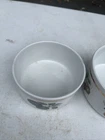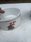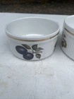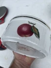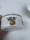 This beautiful ramekin is a piece of Royal Worcester's Evesham Gold collection, made in England in 1961. The intricate pattern features a stunning gold rim and is adorned with the theme of fruits. The item diameter is 3-2/8 inches and the item height is 1-3/4 inches, with a capacity that is currently unknown. The ramekin is made of porcelain and is an original, licensed reproduction. It is a perfect addition to any collection and is suitable for decorative use. The set includes one ramekin, making it a great gift for anyone who appreciates vintage and unique pieces.