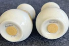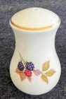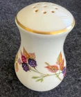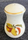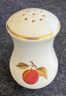 The Royal Worcester Evesham Gold Salt & Pepper Shakers Set is a vintage bone china set originating from England in 1961. Featuring a colorful all-over fruit pattern in a mid-century modern style, these shakers stand at 3 1/4 inches tall. The glossy finish and printed backstamp showcase the craftsmanship of this original production piece by Royal Worcester, known for their art pottery techniques. Perfect for adding a touch of elegance and charm to any dining table or collection, this set embodies the design aesthetic of the 1960s. Stoppers included.