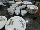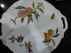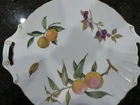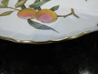 From my own home, kept in my china cabinet and rarely used since 1987...other than the occasional Thanksgiving dinner! I had a full service for 8 from my wedding registry back in 1980s. Some pieces were broken so are missing over the years. Also have some serving pieces. ALL are the EVESHAM gold with fruit leaves and gold rim. This listing is for ONE Fancy Gold Rimmed platter, 12" long at handled end, 11" diameter across non handle area. Gorgeous probably used a couple times since 1987! Cabinet stored. SEE PHOTOS Final photo shows more items I have from my original 8 pc for 7 service all available by lots in my store, I have: Dinner Plates: 7 Tea cups and saucers 5 sets addition teacup saucers 2 Coffee/Tea Mugs 4 small bread/dessert (this lot) plates 8 cereal/soup bowls 7 (1 chipped) larger salad plates 4 THIS scalloped fancy serving platters- 2 available To ship the ENTIRE inventory would be probably around $80-100 but if you ARE interested in buying ALL I have, do let me know. I would probably use more than one box to ship everything. Otherwise this listing is for JUST ONE fancy cake/platter I ship by weight plus insurance to your zip code.