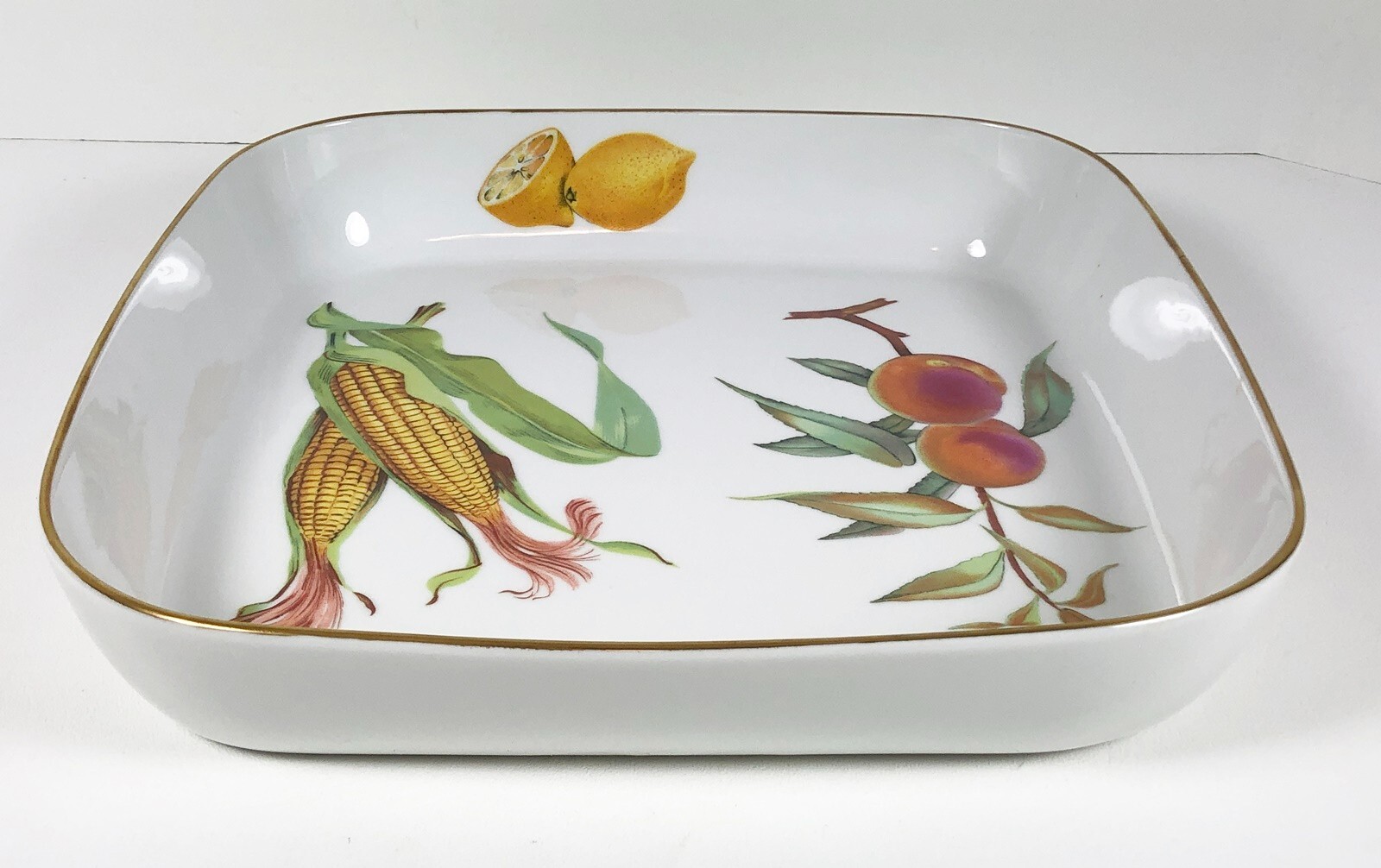 Royal Worcester EVESHAM GOLD Square Casserole Buffet Dish Serving Oven to Table Like new condition. No chips, cracks, crazing or other damage. No wear on the gold trim, all intact. Measures 11-1/4" square. Please see all pictures. Beautiful design of fruits and vegetables.