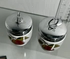 This vintage egg coddler pair from Royal Worcester is a must-have for any collector or lover of classic porcelain dishes. The set features two pieces in the Evesham pattern, one in peach and one in Barrie's. Made of high-quality porcelain, these egg coddlers are perfect for those looking to add a touch of elegance to their kitchen decor.