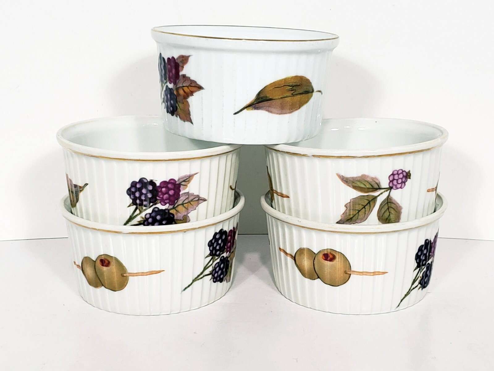 Royal Worcester Evesham Tarte Dish Ramikins Custard Cups Lot Of 8. All included 7 1/2" porcelain tarte dish Two 4" x 1 1/2" porcelain custard / souffle/ Ramikins Five 3"x 1 3/4" porcelain Ramikins All pcs are in excellent condition no chips or cracks
