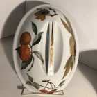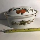 Royal Worcester Gold Evesham Oval Covered Casserole Shape 24 Size 5 Vintage mark about 9.5" inches X 7" X 3.75" high w/out lid In great condition with no cracks, but a couple tiny nicks on the bottom as shown - very tiny & very usabel touch of scratch on the berries on the lid only This was used and needs another cleaning, the area where the lid sits can be cleaned up too, but will have some discolor from usage I have other matching serving items in my E bay store and will combine shipping Please email any questions for this is a final sale Saginaw St Consignments Pontiac Michigan
