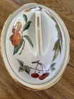 Royal Worcester Gold Evesham Oval Covered Casserole Shape 24 Size 5 Vintage. 1.75 quart. No chips or cracks. Needs a little cleaning. 9.18 inches by 7 inches. Base is 3.78 inches tall with lid on it is 5.5 inches tall. Made in England.