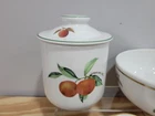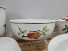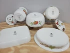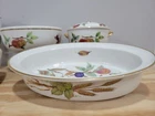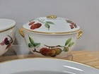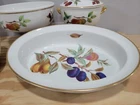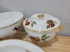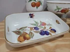 Brand: Royal Worcester Pattern: Gold Evesham Object: 1.5 Pt Round Covered Casserole (5-3/4" Dia. x 3-3/4" H) ____ Small Canister & Lid (6-1/4" H x 4-5/8" Dia.) ____ Oval Serving Bowl (11-1/2" x 8-1/8") ____ Round Serving Bowl (8" Dia. x 2-7/8" H) ____ Rectangular Baking Dish (10-1/4" x 7") Material: Fine China Crafted in England Condition: Displayed collection in mint, excellent cosmetic condition, un-used without box. There is no chip or crack, but might have minor imperfection like scratch, glaze crazing or utensil marks; fast shipping!!!