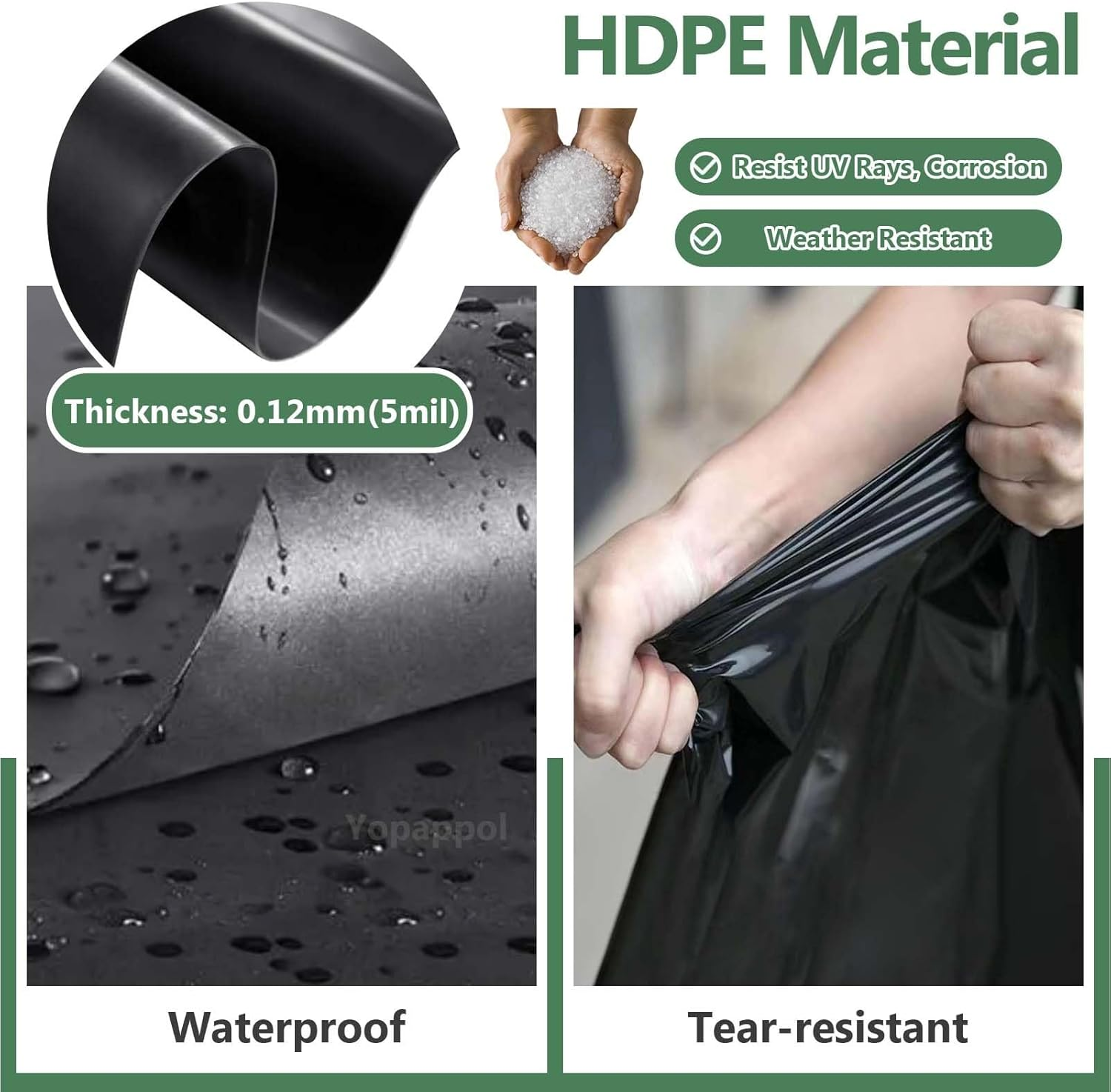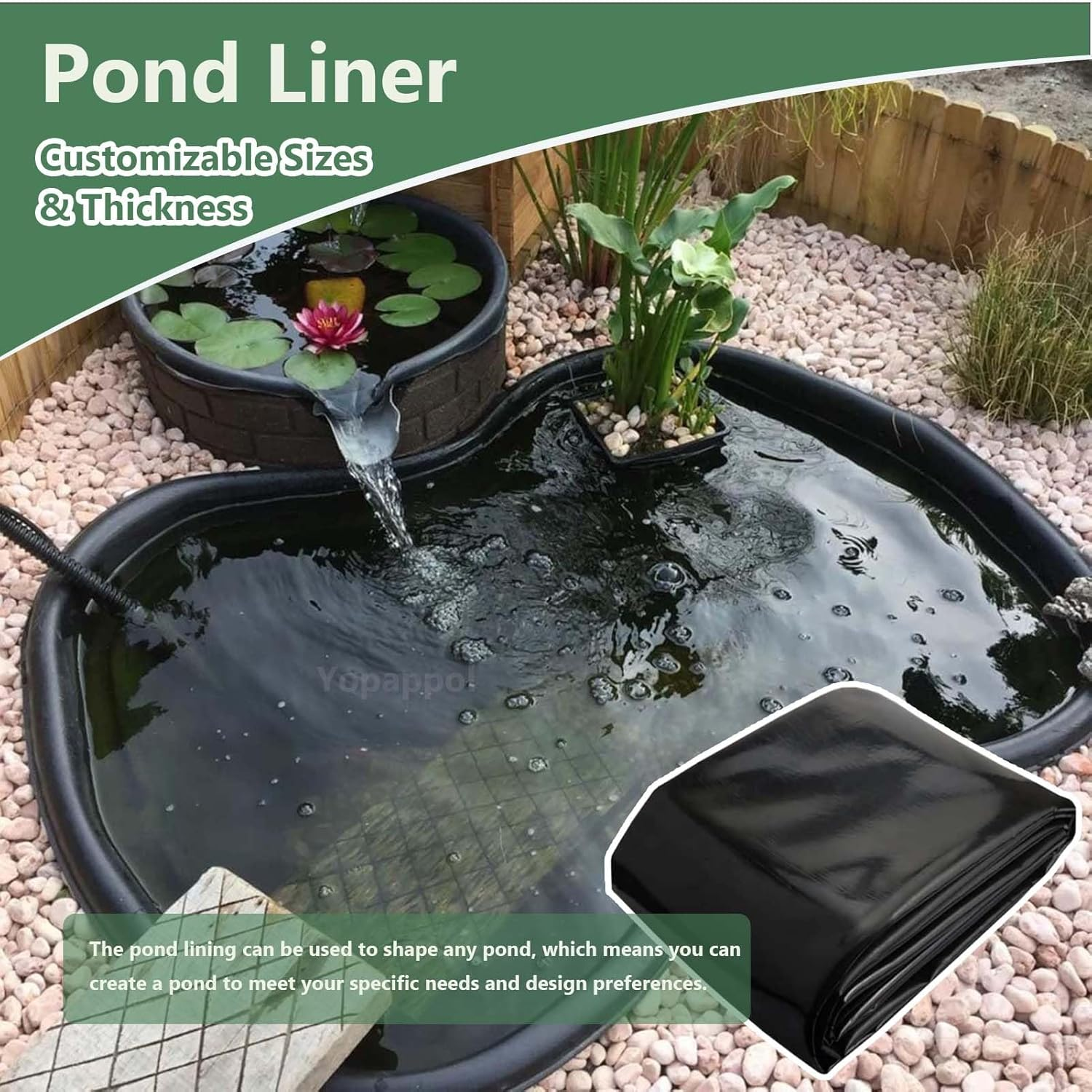 Rubber Pond Underlay 1X8M, 2X4M, 4X6M, 6X10M, 10X15M Black Flexible Garden Fish Pond Liners Impermeable Pond Membrane for Outdoor Landscaping Fountains, Swimming Pool(6.5X8.3Ft) ➤ Durable HDPE Material: The Sturdy pond liner is made of HDPE material, ensuring excellent flexibility and extensibility. With a default thickness of 0.12mm(5mil), resistant to punctures and tears, very long-lasting. ➤ Easy to Cut: Pond liners are flexible, easy to bend and retract, shape around corners to fit nearly any pond shape. So you can easily cut them into the shape & size you need for your specific pond ➤ Customizable size: Our products support customisation, please let us know if you need different sizes. Customised thickness is also available ----0.1mm, 0.2mm, 0.3mm, 0.4mm, 0.5mm. ➤ Product Function: The thick and durable pond Liners provides reliable waterproofing and leak resistance. Can cffectively blocks soil and water, prevent water from seeping into the soil layer, and keep the bottom clean. ➤ Widely Used: Our pond membrane is widely used in fish ponds, fountains, waterfalls, reservoirs, water features, streams, landscaping, water gardens and other water features. It can also be used in planter box, roof tarpaulins, architectural decoration dustproof cloths, plant pergola, etc. The most important function of a HDPE liner is to prevent water from escaping from the pond. It is often used in aquaculture, fish pond breeding, engineering housing anti-seepage, etc. It not only has good weather resistance, but is also non-toxic and harmless to animals & plants and It has no adverse effects on the water ecosystem and ensures that your pond maintains a healthy ecological balance. ➤ Specification Product Name: Waterproof Pond Liner Material: High Density Polyethylene (HDPE) Colour: Black Thickness: Default 0.12mm (5 mil) --- Support for customisation Size: Any size can be customized Item model number 0147 Assembly required No Country of Origin China Item Weight 1.32 pounds Tick-repellent material High Density Polyethylene (HDPE) Department Unisex Adult Number of pieces 1 Package Dimensions 1.18 x 0.79 x 0.39 inches Size 6.5x8.3ft 0.79 inches x 1.18 inches x 0.39 inches. Weight: 1.32 lb Shipping from the USA All of our products are shipped from the USA, ensuring quick delivery to your destination. Payment We offer the following payment methods: PayPal, credit card, bank transfer, and eBay's secure payment system. Free Shipping & Free Returns Shipping within the USA is FREE. Additionally, any return is absolutely free for you. Risk-Free Purchase You have the option to return an item within 30 days without any justification. We cover the return shipping costs! Fast Shipping We ship immediately upon receipt of payment. Generally, the package is delivered within 2-3 days in the USA. If it takes longer, we will contact you. Quality and Costs Made in Europe, USA, China No customs fees or additional charges Total satisfaction guarantee Invoice with declared VAT available upon request in .pdf format Feedback Your feedback is very important to us. After you pay for your purchase, you will automatically receive positive feedback from us.