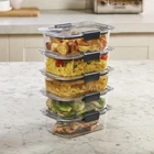 Rubbermaid Brilliance Food Storage Containers, Set of 5 (3.2 Cup) Containers Product Details Recommended Uses For Product: Meal Prep Special Feature: Airtight, Leak Resistant Container Shape: Rectangular Closure Type: Clip-On Is Dishwasher Safe: Yes Material Type Free: BPA Free Item Package Quantity: 1 Item Weight: 0.01 Ounces Product Care Instructions: Dishwasher Safe Item Volume: 3.2 Cups Unit Count: 5.0 Count Is Microwaveable: Yes Item Form: Rectangular Manufacturer: Rubbermaid Size: Set of 5 (3.2 Cup) Containers UPC: 05 Part Number: 2041405 Item Weight: 0.01 ounces Product Dimensions: 10.2 x 8.19 x 5.67 inches Country of Origin: USA Item model number: 2053295 Is Discontinued By Manufacturer: No Style: Set of 5 (3.2 Cup) Containers Pattern: Container Shape: Rectangular Number Of Pieces: 5 Special Features: Airtight, Leak Resistant Batteries Included?: No Batteries Required?: No Number of Sets: 5 Brand: Rubbermaid Material: Plastic Material Feature: BPA Free Capacity: 757 Milliliters Product Dimensions: 10.2"L x 8.19"W x 5.67"H Crystal-clear Tritan Built: Stain-resistant and odor-resistant material for a clear view of contents Lightweight & Sturdy: Easy to carry, yet durable for everyday use Built-in Vents: Convenient microwave heating without removing the lid Space-saving: Stackable design for organized fridge or pantry Dishwasher, Microwave & Freezer Safe: Easy and safe to use in various conditions Large Set: Includes five 3.2-cup containers and matching lids, totaling 10 pieces Revolutionize your meal prep with the Rubbermaid Brilliance Food Storage Containers set. Made from BPA-free Tritan, these high-quality containers are visibly clear like glass, but are incredibly durable and easy to carry. They feature 100% leak-proof seals and secure latches to preserve freshness and prevent spills. Not only are they stain and odor-resistant, but they also have built-in vents under latches for mess-free microwaving with the lid on. With a stackable design, they ensure space-efficiency in your fridge or pantry, improving organization and accessibility. This pack comes with five 3.2-cup plastic containers and matching lids.