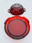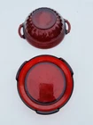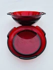 This beautiful ruby red candy dish with pedestal is the perfect addition to your collection. Made from high-quality glass by Indiana Glass, this candy dish is both elegant and functional. Great for holding your favorite sweets, the deep red color adds a pop of color to any room. The dish features a classic design with a sturdy pedestal base and a matching lid. Whether you're using it as a decorative piece or for serving candy and other treats, this dish is sure to impress. Get yours today and add a touch of class to your home decor! Approximately 7inches in circumference 2.5 in depth. 3.22.24