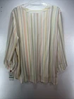 Add this Ruby Road blouse to your wardrobe today! The stylish striped pattern, long roll-tab sleeves, and v-neckline make it a versatile piece perfect for any occasion. Made from a comfortable blend of polyester and spandex, this size large blouse is perfect for women who want to look and feel great. The multicolor design is perfect for pairing with your favorite skirts or jeans. Don't miss out on this must-have blouse!