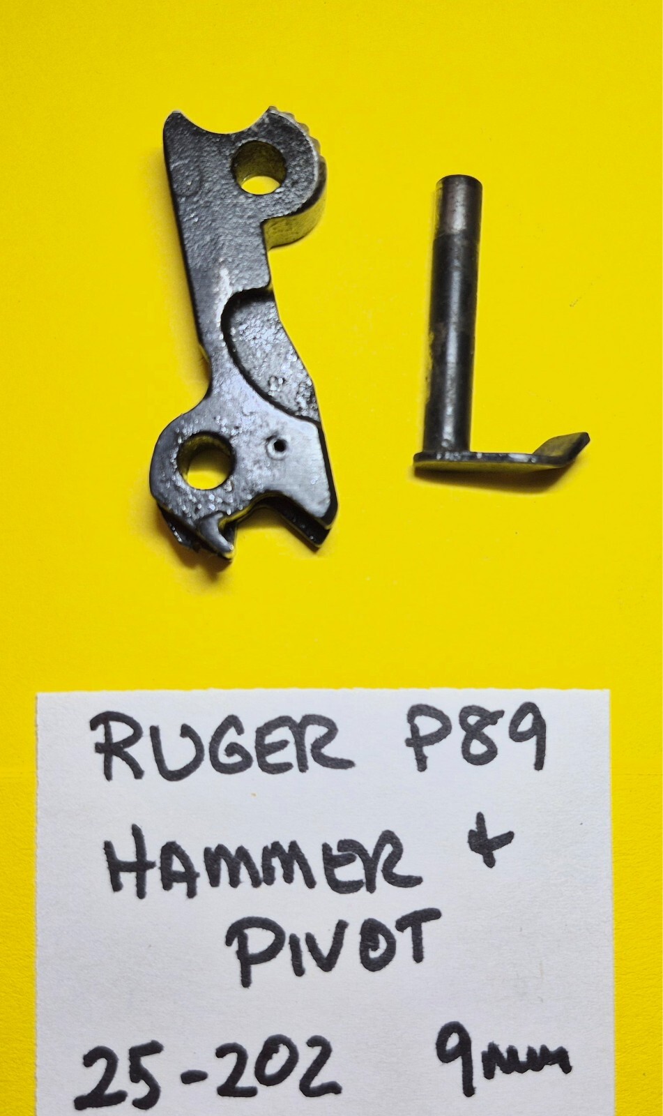 Ruger Model P89 Hammer & Pivot 9mm ITEM #25-202 THERE IS NO FRAME OR RECEIVER THANK YOU FOR LOOKING AT OUR LISTINGS. This listing is in full compliance with all eBay rules and regulations related to all firearms and parts. We list NO frames or receivers. WE SHIP TO U.S.A. ADDRESSES ONLY! NO INTERNATIONAL SHIPPING. Parts May show some blemishes, scratches & handling marks here and there. What you see in the picture is what will be shipped, no more, no less, so please check carefully to insure that the parts you need are included. Don’t miss a bargain on these hard to find parts! Some parts will require cleaning. These parts are used and will show signs of use. We have a 100% CUSTOMER SATISFACTION POLICY! Please notify of us through eBay if you have any problems within three days of receipt of the item. In no event shall we, our officers, directors, employees and/or other representatives be liable for any damages of any kind, including without limitation, direct, indirect, compensatory, special, consequential, punitive, and/or incidental damages related to the products sold. All firearms parts should be inspected and installed by a competent gunsmith.