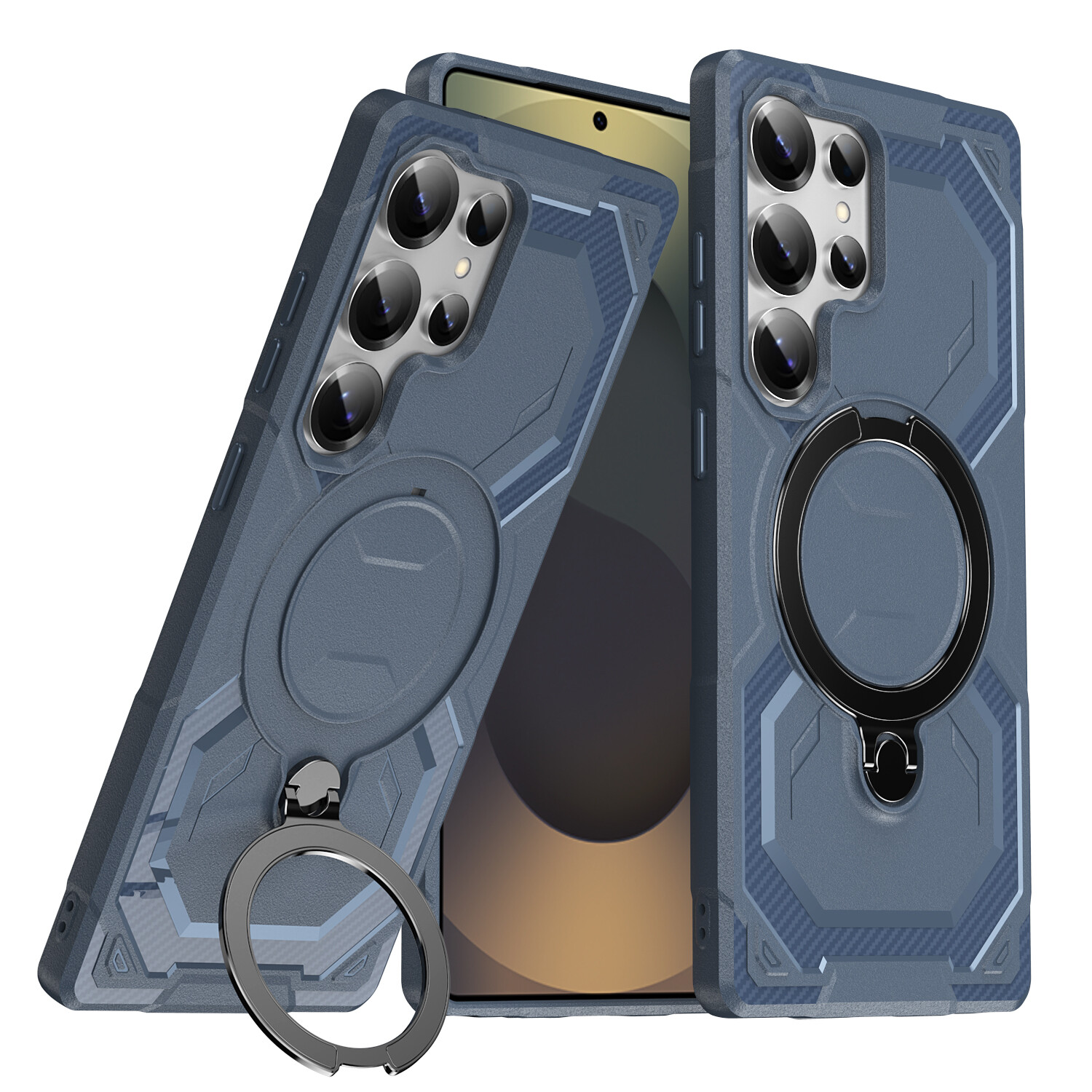 Rugged Case For Samsung Galaxy S25 Ultra S24 FE S23+ Ring Stand Mag Safe Cover 1. Magnetic Car Mount Compatible – Equipped with powerful N52 magnets, ensuring a firm hold on MagSafe chargers and car mounts for hassle-free wireless charging. 2. Ultimate Shock Absorption – Built with TPU + PC hybrid construction, providing drop-proof protection for accidental falls and everyday impacts. 3. Built-in 360° Rotating Metal Ring – The ring stand acts as a secure grip and a hands-free stand for watching videos or making video calls. 4. Textured Non-Slip Finish – The laser-engraved carbon fiber texture offers a premium look, while preventing slips, smudges, and scratches. 5. Full Edge & Camera Protection – Raised bezels protect your screen and camera lens from scratches, dust, and direct impact.