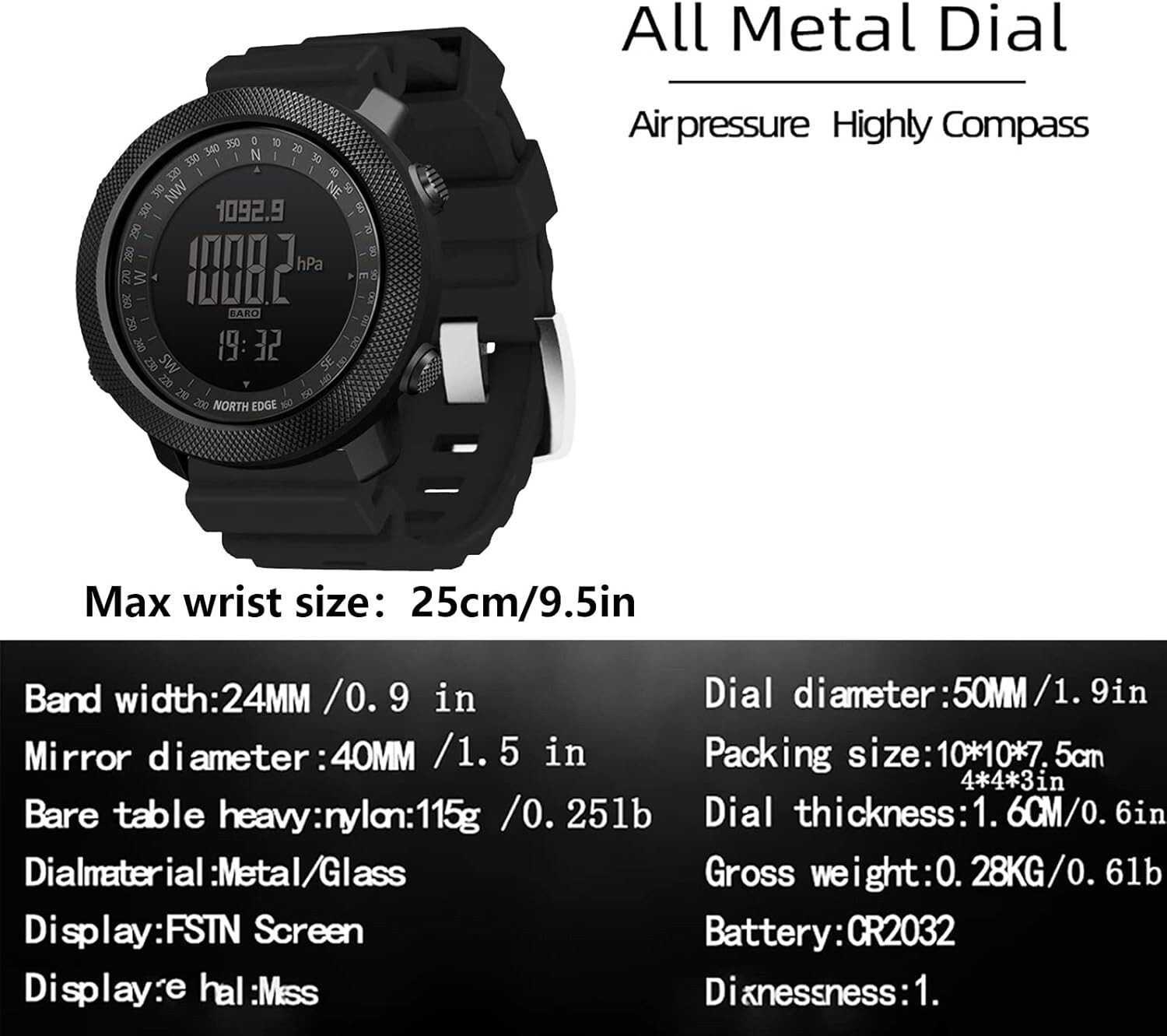Tactical Watches for Men Digital Outdoor Survival Military Rock Solid Digital Watches with Durable Band, Steps Tracker Pedometer Calories Clasp type Double Pusher Foldover Clasp Item type name Sport Watch Country of Origin China Battery life :18 s Function Brief:Compass, Altimeter,Barometer , Thermometer,Weather Forecast, World Time,Dual Time,Pedometer, calorie, distance record,2 sets alarm,Countdown timer ,Stopwatch, EL Backlight. Materials: Solid metal case with durable and breathable nylon band ,Japenese battery. (CR2032 18s life). Watch Size: Diameter: 50mm/; thickness: 16mm/; width of band: 24mm/; net weight: 117g/ Waterproof: 50M waterproof, means you could wearing it for swimming (not diving), don't push the button when it is under water, also do not wearing it for hot water bath, it will reduce its life span. Package Include: Watch X1; manual X1, packed in a black square gift box. Product details Clasp type Double Pusher Foldover Clasp Item type name Sport Watch Country of Origin China About this item Battery life :18 s Function Brief:Compass, Altimeter,Barometer , Thermometer,Weather Forecast, World Time,Dual Time,Pedometer, calorie, distance record,2 sets alarm,Countdown timer ,Stopwatch, EL Backlight. Materials: Solid metal case with durable and breathable nylon band ,Japenese battery. (CR2032 18s life). Watch Size: Diameter: 50mm/; thickness: 16mm/; width of band: 24mm/; net weight: 117g/ Waterproof: 50M waterproof, means you could wearing it for swimming (not diving), don't push the button when it is under water, also do not wearing it for hot water bath, it will reduce its life span. Package Include: Watch X1; manual X1, packed in a black square gift box. See more About this item