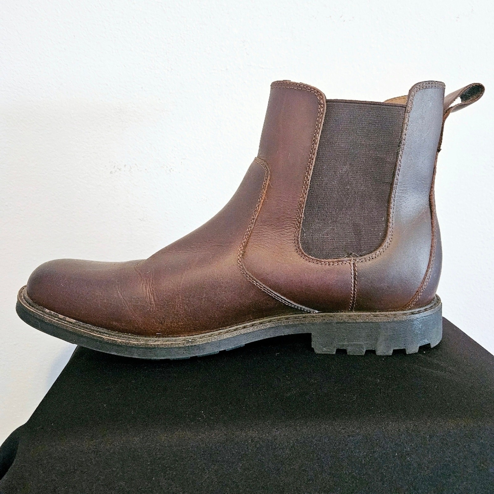 G.H.BASS pull on Charles boots Rugged and Waterproof Men's Chelsea-style boots An ankle-high boot with an elastic side panels and a pull-tab at the back for easy slip-on and removal Men's Brown Leather Waterproof Ankle Boots Rich, saddle brown color. Boots are waterproof leather with a round toe, block heel, and durable rubber outsoles. Excellent, gently used condition. Condition: Like new without box size 12