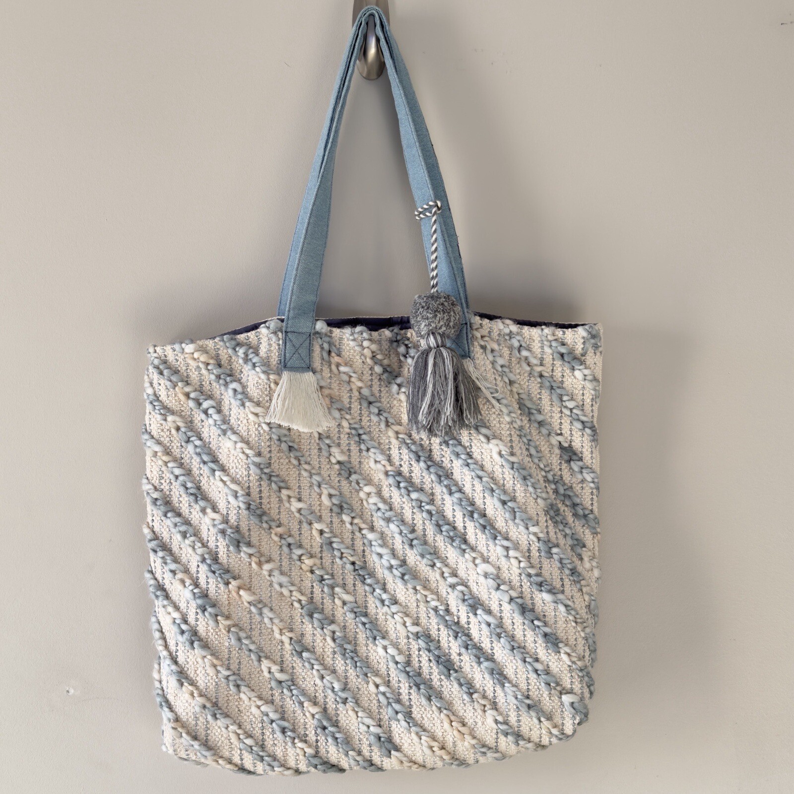 This Ruggine Prairie Boho Beachy Pom Pom Chic Tote is the perfect accessory for any fashion-forward woman. With its vibrant blue exterior and colorful, bohemian, ethnic theme, this hobo bag is sure to turn heads. Featuring a snap closure and a shoulder strap handle style made of cotton, this lightweight tote is large enough to store all your essentials. The interior contains inner pockets and is lined with soft, blue cotton. Made in India, this tote from Ruggine is a unique and stylish addition to any wardrobe.