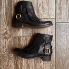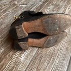 Step into luxury with Rupert Sanderson's Italian-made fringe ankle boots. Crafted from quality leather, these boots combine elegance with a modern twist. The zip and buckle detailing add a chic touch, making them an essential addition to your wardrobe. Elevate your style and make a statement with every step. • Fringe detail for added style • Gold-tone zip and buckle closures • Ankle boot design • Made in Italy Condition shows slight wear on the sole. Heel to toe = 9.5 inches, Heel height = 2 inches.