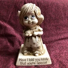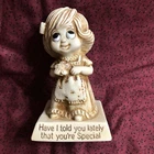 This is a vintage 1976 Russ Berrie & Co Sillisculpt Figurine featuring a little big eyed girl and the phrase "HAVE I TOLD YOU LATELY THAT YOU'RE SPECIAL?". This figuring stands approximately 5 inches tall and is in excellent used Condition. It is made in the USA and numbered 9091. Shipped via USPS.