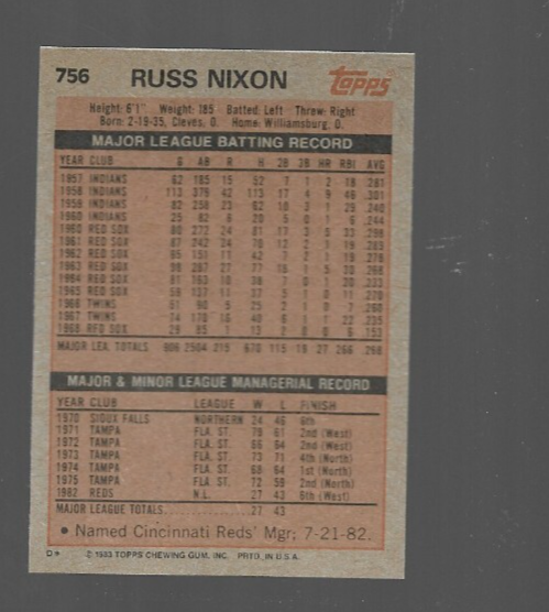 PLEASE READ THROUGHOUT DESCRIPTION. Good day. No insurance. Please NO e-Checks, they take too much time to clear . FREE shipping to Canada and USA and $9 rest of the world. Russ Nixon 1983 Topps #756 Manager Cincinnati Reds Feel free to ask questions. NO LOCAL PICKUP . PAYPAL is of course the preferred method of payment. Thanks for looking and happy bidding
