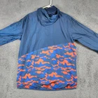 Lightweight windbreaker jacket with hood and full zip front. Features blue and orange camo print on lower half, mesh side panels for ventilation, and elastic cuffs. Two zip pockets. Good used condition with normal wear. Perfect for layering. Insulation Material: Polyester Features: Hooded, Full Zip, Mesh Panels, Zipped Pockets, Lightweight Type: Jacket Style: Windbreaker Outer Shell Material: Nylon Department: Men Color: Multicolor Lining Material: Polyester Accents: Zipper, Logo, Mesh Pattern: Camouflage Model: Russell Athletic Camo Mesh Windbreaker Keywords: windbreaker, camo jacket, hooded jacket, athletic wear, russell athletic, mesh panels, zip up, lightweight jacket, blue orange camo, sports jacket all items have been cleaned and disinfected we stand behind all items we sell so please contact us if you have an issue with any order