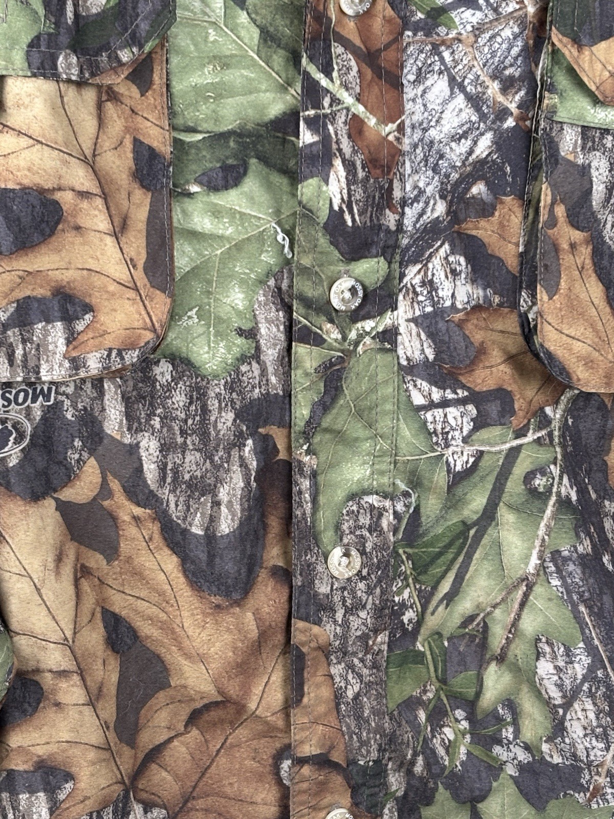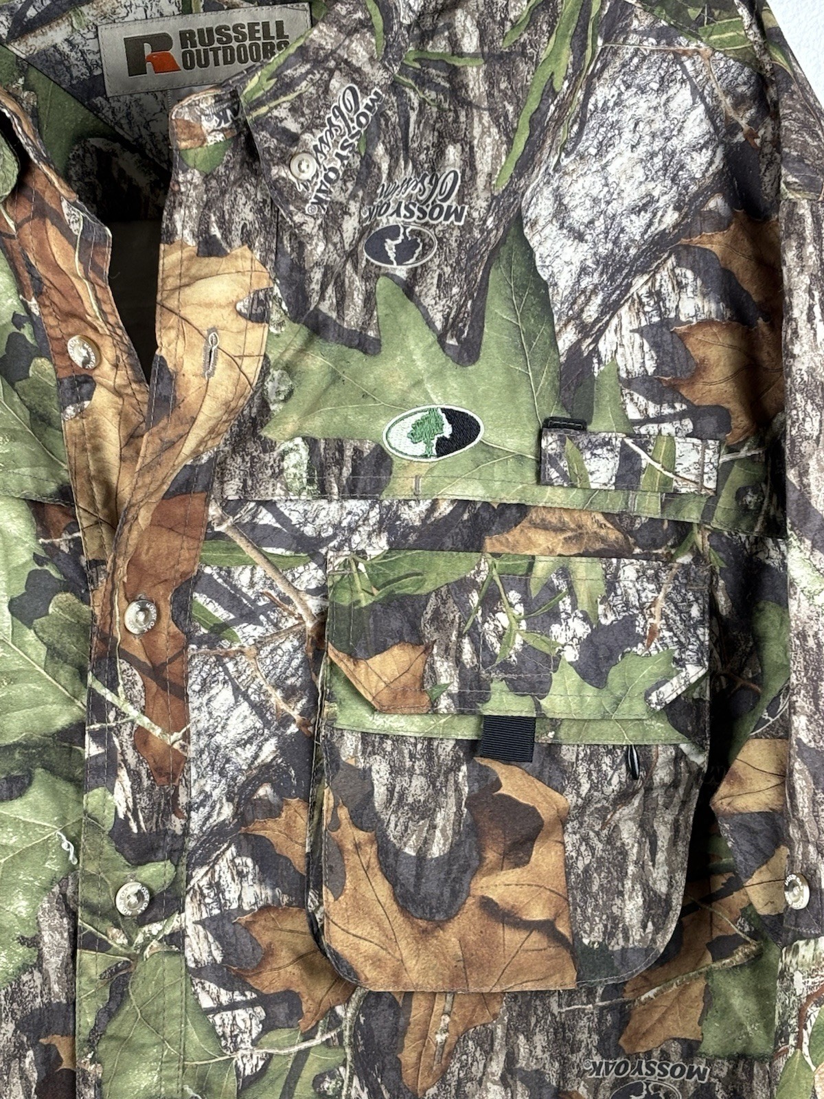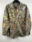 Russell outdoors L/S men’s camo shirt Large treklite mossy oak obsession pockets Long sleeves Very nice lightweight treklite fabric Sleeves roll up and secure with buttons Excellent used condition No significant flaws, rips, tears or stains See photos for more condition details Size on tag: large Chest width (pit to pit). 25” Length (collar to hem) 32” Sleeve (collar center to cuff) 35” Ship fast via USPS. THANKS FOR SHOPPING