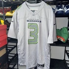 Show your support for the Seattle Seahawks with this officially licensed Nike jersey featuring Russell Wilson's name and number on the back. Made with Dri-FIT technology, this gray jersey is perfect for any football fan. It's designed for men and comes in size L, with a regular fit. The jersey is perfect for game day or any day, and is sure to make you stand out in any crowd. As a part of the Nike Atmosphere collection, this jersey is a must-have for any true football fan. Get yours today and show your support for the Seattle Seahawks!