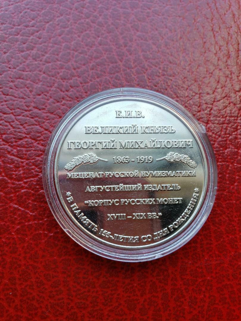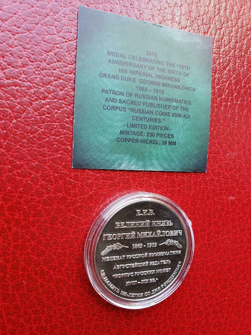 H.I.H. Grand Duke George Mikhailovich Romanov (1863-1919). Его Императорское Высотчество Великий Князь Георгий Михаилович Романов. Medal struck to celebrate His Imperial Highness 155th Birthday anniversary. Medal minted in 2018. Grand Duke George Mikhailovich is a Patron and King of all Russian Numismatics. He is an honor publisher of the Corpus of Russian Imperial coinage, known as "Moneti Tsarsvovaniya..." This medal is struck in proof. 39 mm. Copper-nickel. It comes in 2 x 2 inches poster with a color photo of Grand Duke on one side and short description on another. This beautiful piece of Russian Royal History and its Famous Russian Numismatist will be a great addition to your collection or a gift ! We offer FREE shipping in USA.