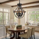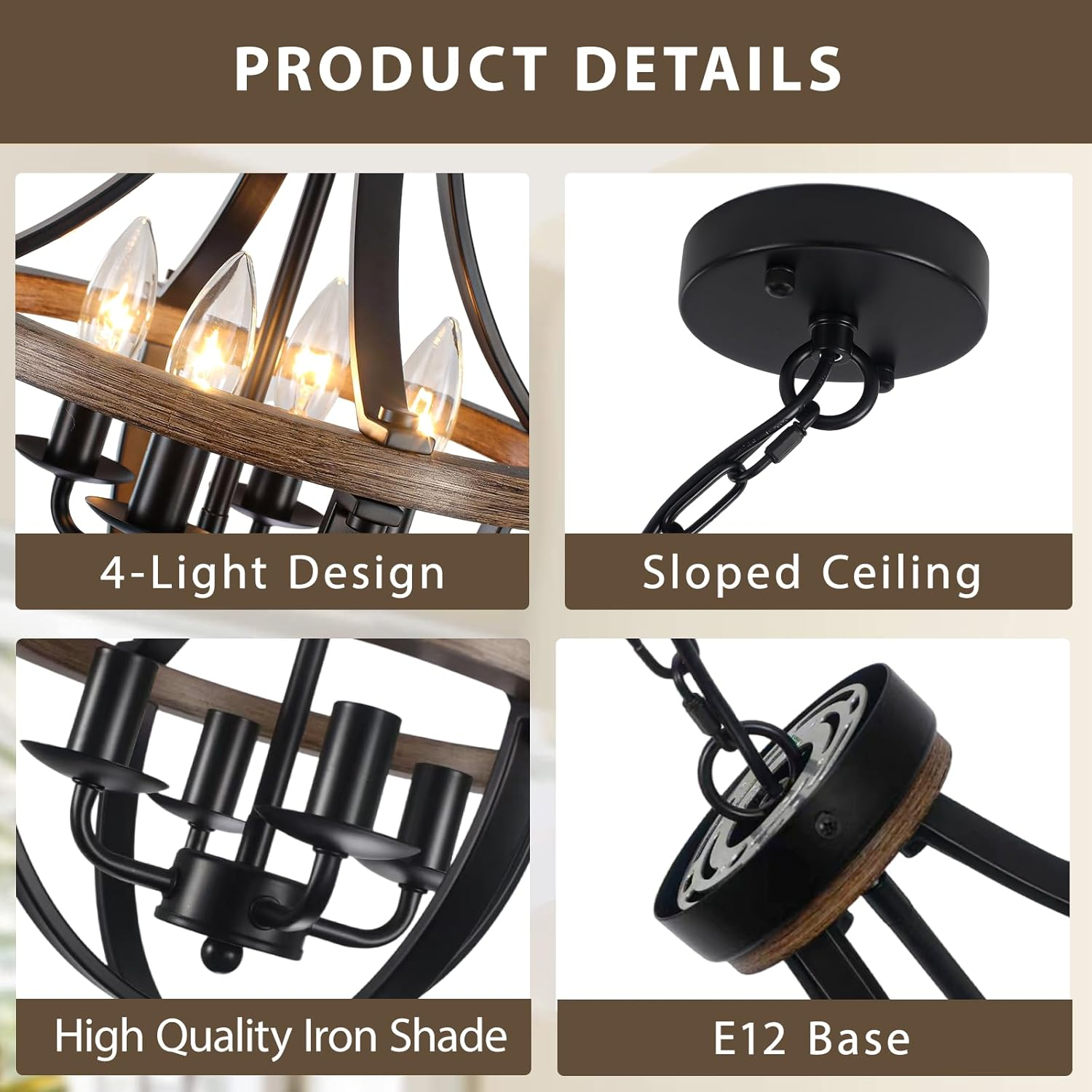 [Details & Features:] Retro farm chandelier, this black 4-light ceiling lamp is made of high-strength and high-quality metal to ensure durability. Thick wood is coated with artificial wood grain, giving it a strong pastoral atmosphere and adding a sense of home. This semi-embedded chandelier is suitable for ceiling lamps hanging in the entrance hall, balcony, Entrance,corridor, living room, kitchen, dining table and kitchen island. [Adjustable brightness] Our retro farmhouse chandelier has four standard E12 light holders,and the maximum 40-watt candlestick (E12) bulb can use incandescent light, LED, Edison and halogen bulb. When dimmable bulbs and compatible dimmer switches are installed, the lights can be brighten dimmed (excluding bulbs and switches). [Height adjustable]: This farm chandelier can be installed obliquely on the ceiling. (Lamp size: 13.78 inches high and 12.3 inches wide) Equipped adjustable with a chain (about 48 inches),it can be hung in different positions and installed at the height you like. [Easy to Install]: This dining room chandelier is easy to assemble and install, with all installation hardware and instructions included for a quick and easy installation.(Refer to the installation video.) 【Safety and quality assurance】this retro semi-embedded ceiling lamp or hanging chandelier ,ETL certification has been passed, please feel free to use it. We provide warranty, if you need to contact us, we will help you solve the problem quickly! Product Description Product description SZZYAJG 4 lights The farmhouse hangs chandeliers, This bird cage design is made of high quality wood and high strength metal. hand-painted wood grain, brown and matte black finish , Beautiful retro look. Convertible lamps Convertible pendant lamps Variable semi-pumped ceiling light Lamps Specifications: Color:Black ,Brown wood grain Diameter: 13.7 in, Height: 13.78~61 in Number of Lights: 4 Bulb base: E12 Max.Power: 4*40W Voltage: 110~120V Type of Bulb: CFL/LED/Incandescent/Dimmable Bulb (bulb not included) Convertible Light Fixture Convertible hanging pendant light Convertible semi-flush mount ceiling light Unique design Simple curvy silhouette, vintage wood texture, The chandelier was crafted by a skilled craftsman. In addition, the chandelier contains a large number of structural components with special shapes, thick wood and high-quality metal, This farmhouse pendant light has an open design and consists of 4 E12 lamp holders that emit lots of light and illuminate the entire space Ideal for toilet islands, bedroom corridors, entrances, stairs, dining and living rooms. Give this rustic chandelier a modern farmhouse vibe.