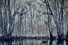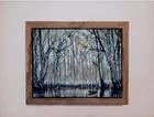 "Conoho Woods" was photographed by the creator on March 21, 2021 in Martin County, NC. It depicts a forest of Bald Cypress trees along the swampy Conoho Creek. Image has been enhanced to resemble a painting and laminated into a wooden frame.
