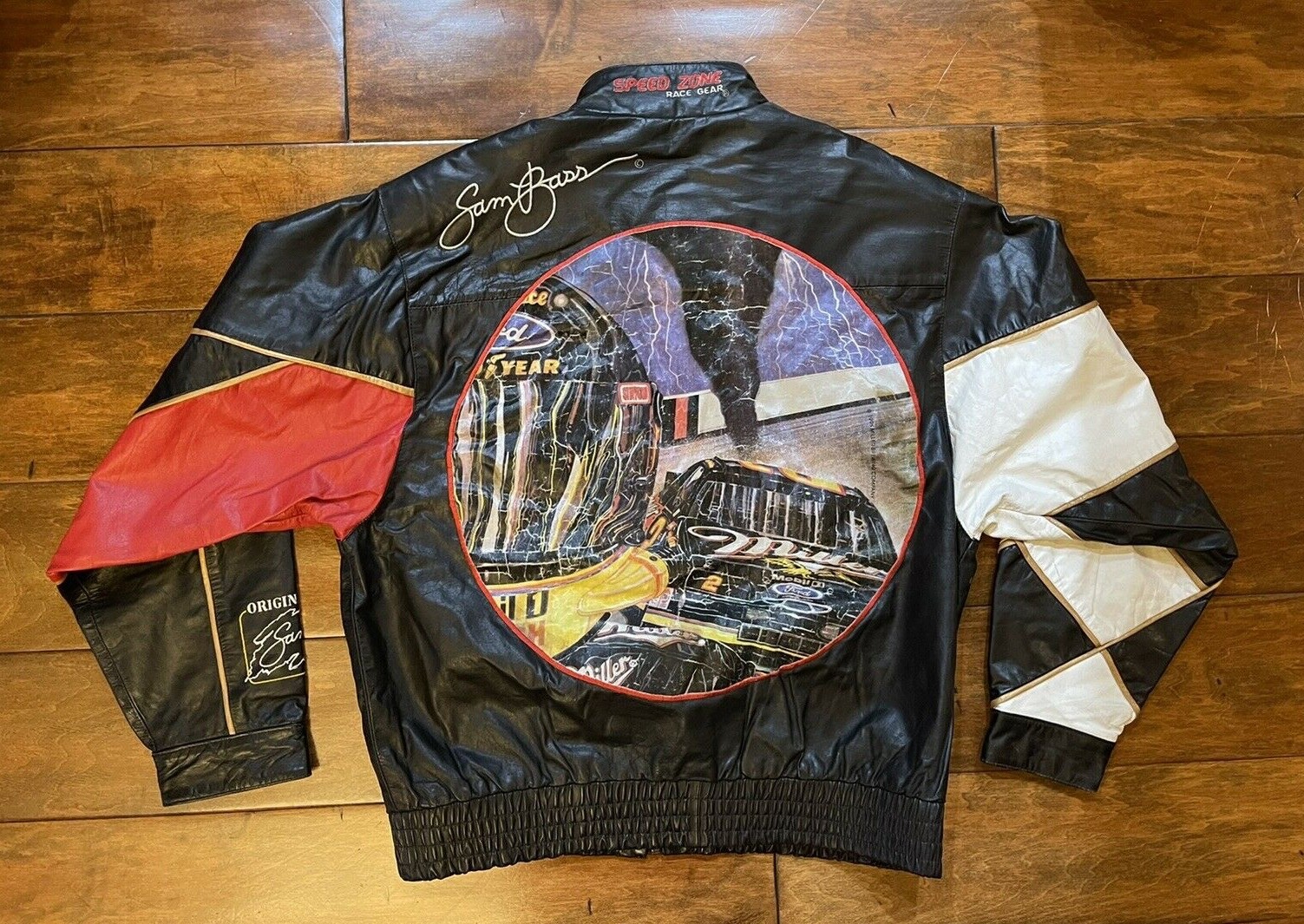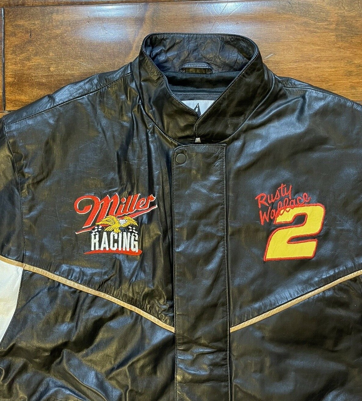 Rusty Wallace #2 Sam Bass Miller Racing Leather Race Jacket Mens X Large NASCAR Speed Zone Pre-owned in overall good condition. Condition can be seen in the photos. Artwork on back of jacket has some discoloration which can be seen in the photos. Check description for measurements. This jacket is rare and hard to find. Top to Bottom: 26.5 in Pit to Pit: 25 in Shoulder to Shoulder: 21.75 in Sleeve (From shoulder to end of sleeve): 25.5 in Ships within 1 business day of payment being received!! Checkout my other items for sale for other NASCAR gear, clothings, hats, sports memorabilia and much much more!! Don't hesitate to ask any questions!!