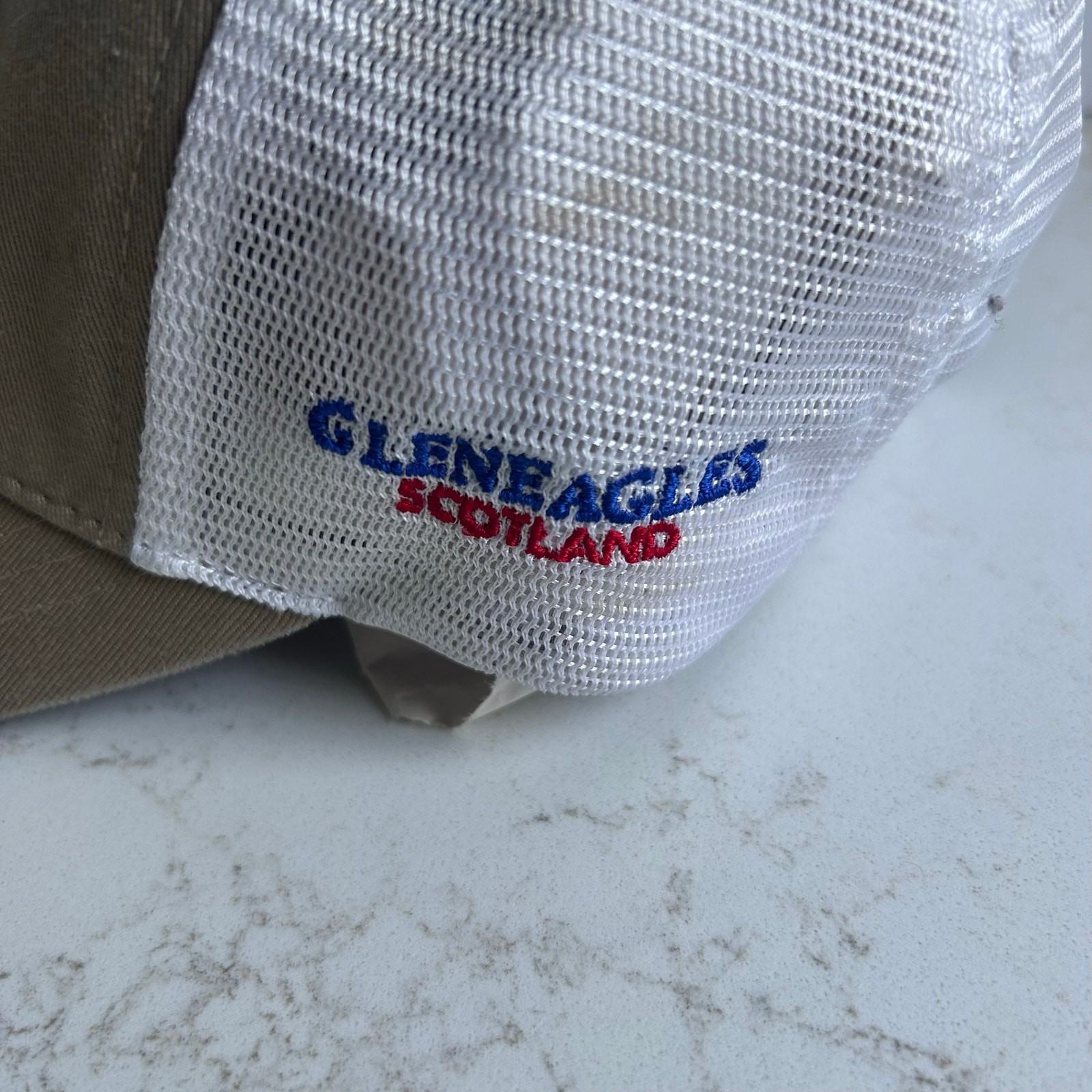 Authentic Ryder Cup 2014 Gleneagles Scotland hat by Imperial Sports. Features a tan cotton front panel, white mesh back, and embroidered Ryder Cup crest. Adjustable strap. Clean and in excellent pre-owned condition. Details: • Brand: Imperial • Event: Ryder Cup 2014 • Location embroidery: Gleneagles, Scotland • Style: Trucker / Mesh Back • Color: Tan + White • Size: One Size Adjustable • Condition: Great (no stains or damage noted)