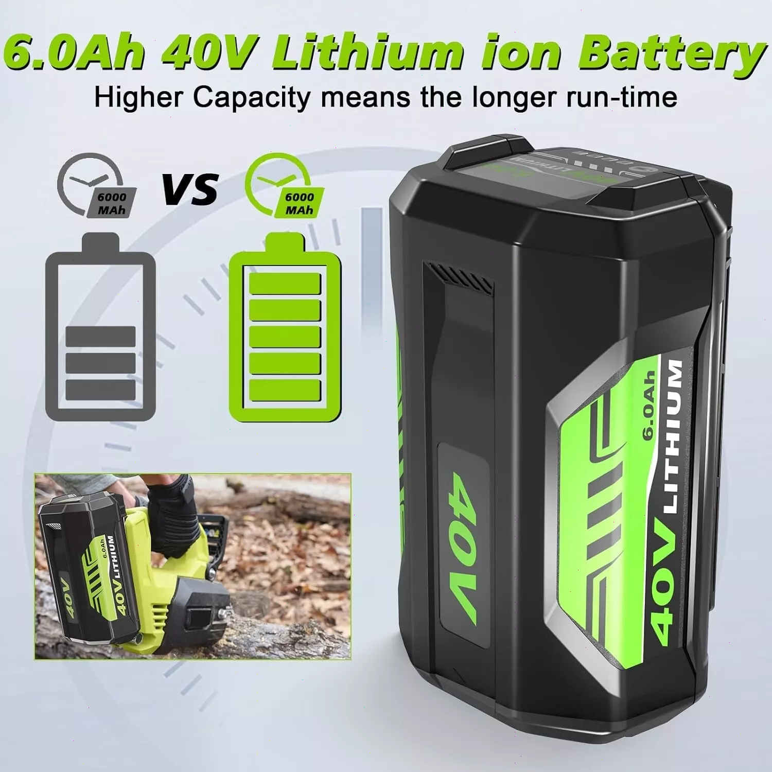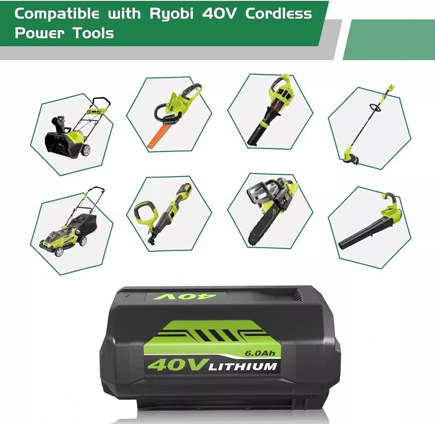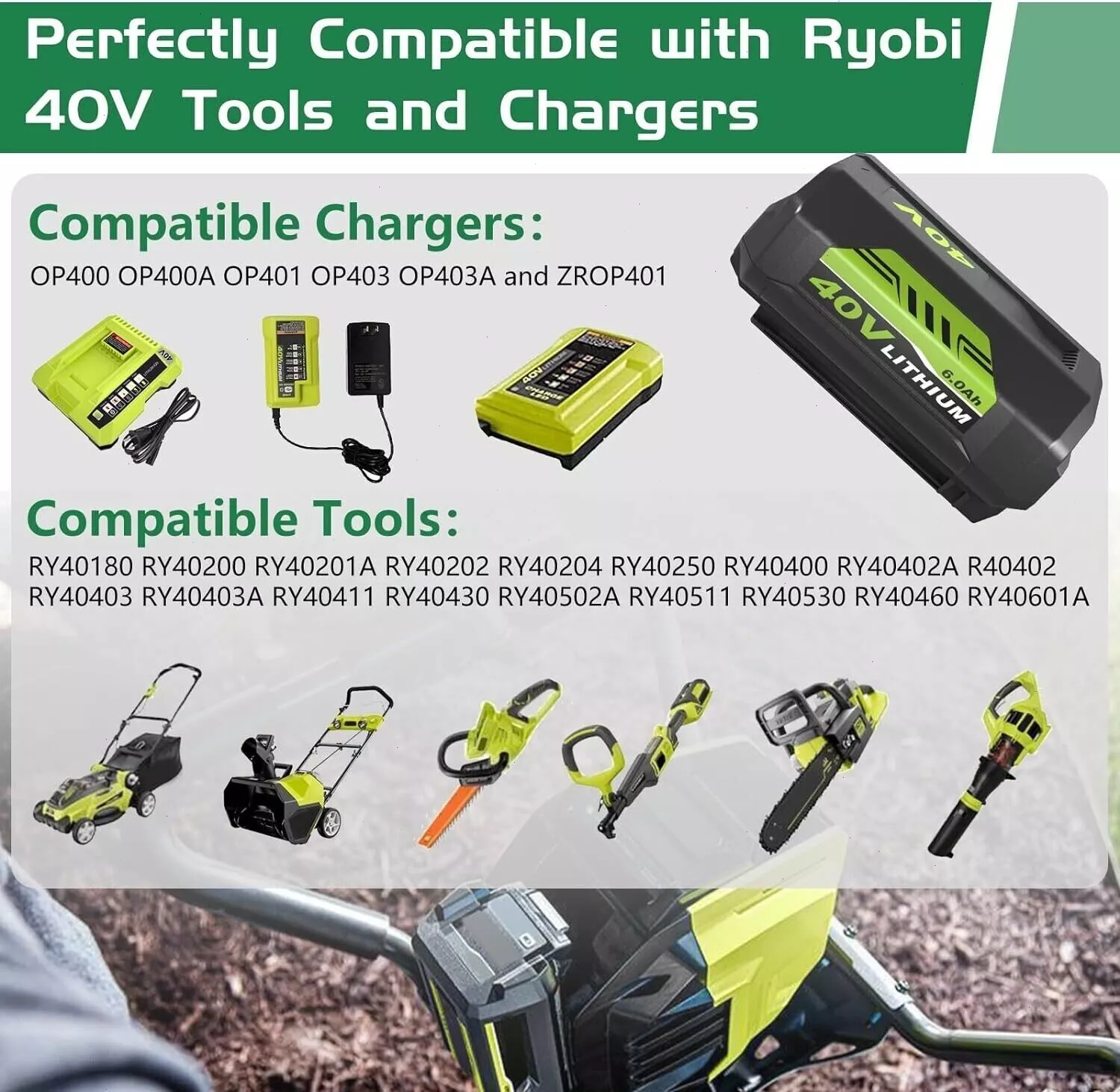 Product Description Previous page Next page Lagre Capacity Wide Compatibility Safe & Reliable LED Indicator High Quality Compatible with Ryobi 40V Battery Chargers & Tools Feature Battery Capacity: 6000mAh / Voltage: 40-Volt / Battery Type: Lithium ion Fit for Ryobi Battery PN OP4050A, OP4015, OP4026, OP40201, OP40261, OP4030, OP40301, OP4040, OP40401, OP4050, OP40501, OP40601 (Please use the “Ctrl+F” to search your model) Fit for Ryobi Tools Model RY40180, RY40200, RY40022, RY40201A, RY40202, RY40204, RY40400, R40402, RY40402A, RY40403, RY40403A, RY40411, RY40502A, RY40503, RY40511, RY40601A, RY40LM30, RY40190, RY40430, RY40620, RY40460, RY40250, RY40770, RY40850, RY40610A, RY40210B, RY40240, RY40440. (Doesn't fit RY40002, RY40408) Fit for Ryobi Charger Model OP400, OP400A, OP401, OP403, OP403A, OP404A, OP406A, ZROP401