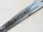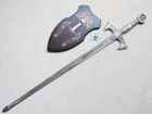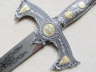 Knight templar sword, from the movie King Arthur, 47.8" or 121cm long, 24cm wide, 2.2kg net, 3.84kg with package, brand new, pointed, unsharpened; Stainless steel double-edged blade, half false edge with black floral imprints with a knight on horse, 92cm long, 4.5cm wide, 0.51cm thick; The guard and pommel have two toned gold and antiqued silver finish, cross, knights and horses relief details, with the handle, 15cm long; Brown wall display plaque with golden battle-worn Gondor tree and scrollwork pattern; The blade has a beautiful scroll work pattern of the cross of Jerusalem. The guard is a cruciform with a Oakeshott type 6 design. The symbol of the Knights Templar has been added in golden steel to the center of the guard. Each arm of the guard features a symbol of the Knights Templar. The handle of the sword has been constructed from steel with a complex design of scroll work. The pommel is a Oakeshott type G with a cut out cross; The crusader heirloom quality sword is a striking example of beauty and design. The crusader cross cast within the pommel exemplifies the heroism and Christian faith that led Medieval knights through the Crusade wars. The Crusades created a tumultuous period when Western armies, fired with the crusading spirit, wrestled most of the Holy Land from the Muslims. Holding it was a different matter, and the Crusaders were never again able to match their initial success. The West--still somewhat barbaric--learned a great deal from their opponents, bringing back new knowledge from their travels. (Some historians believe the Crusades helped encourage a thirst for exploration among Europeans that helped foment the discovery of America.) The Templar Order was established in 1118 A.D. to ensure the safety of the Holy Land and to protect the pilgrimage routes. The institution reached its maximum splendor in the 13th century. The Knights Templar considered themselves to be Knights of God, the honor of the church and of Christianity. Their motto was: "NON NOBIS, DOMINE, NON NOBIS, SED TUO NOMINI DA GLORIAM." (Not to us, God, not to us, but to Your name give glory."). It was a very well-organized military force, and they were the shock forces in the Crusades. They were the vanguard during attacks and the rearguard during retreats. For a century they ensured the effective governance of the Latin kingdom of Constantinople. They did not pay taxes or tributes, and they had properties all over Europe and the Middle East. They obeyed only the Pope.