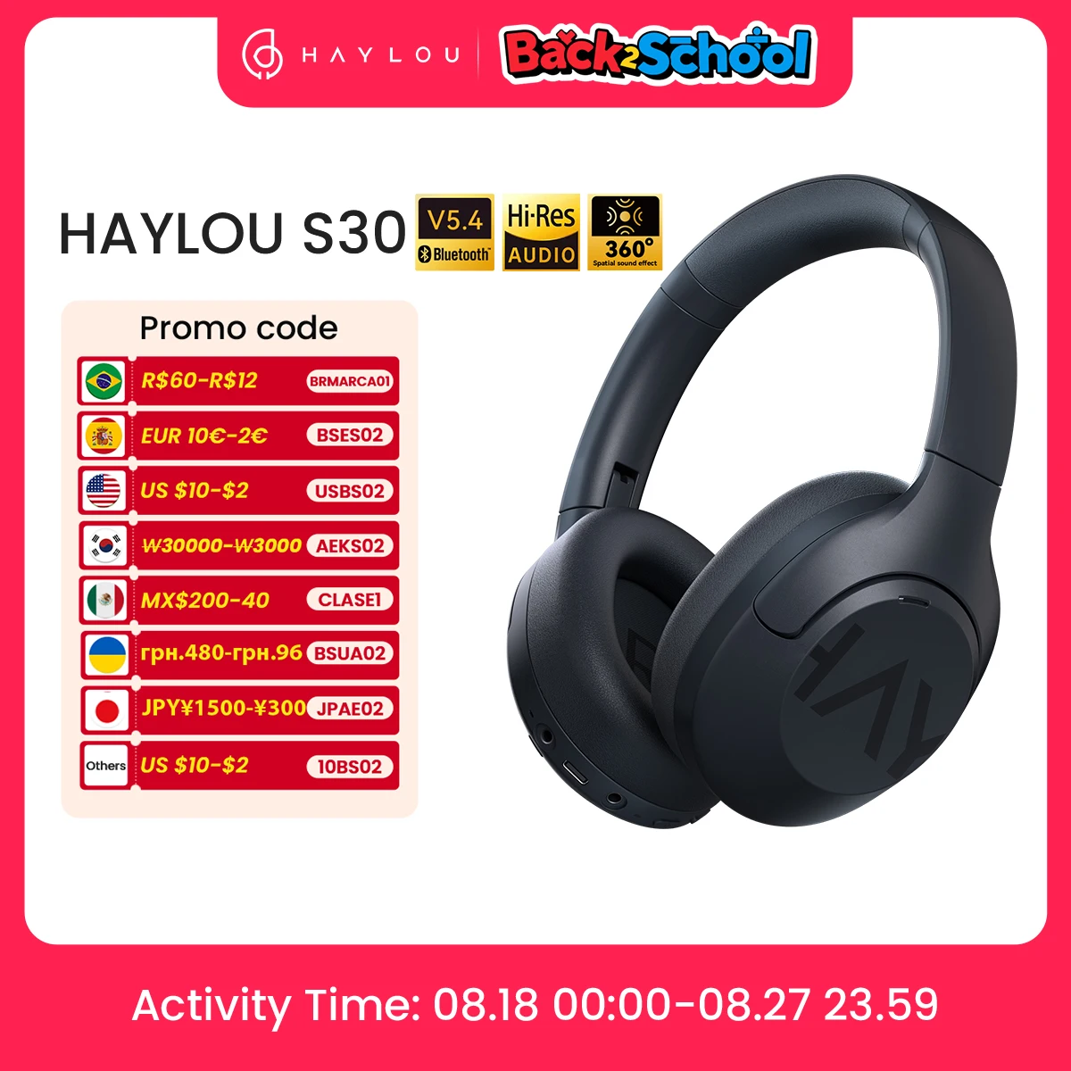 HAYLOU S30 ANC Wireless Bluetooth 5.4 Headphones Detall-Rich Sound 43dB Adaptive Noise Cancelling Headsets 40mm Driver 80H Playtime Earphones Customized APP Handsfree calls -43dB ANC | Bluetooth 5.4 Certified Hi-Res Audio Fast Charging & 80-hour Battery Life 40mm dynamic driver 360° spatial sound effect Dual-device Connection Quick conversation Detachable microphone(*The Standard version and Pro version comes with an e-sports mic) Skin-friendly protein leather earmuffs Smart APP -43dB ANC AI Noise Cancellation. A Brilliantly Quiet WorldWith hybrid ANC technology, the feed-forward and feedback microphones work together to effectively separate background noise of up to 43dB, allowing you to immerse in beautiful music. Bluetooth 5.4 A Smooth Gaming Experience. Bluetooth 5.4 protocol ensures a fast and stable connection with strong anti-interference ability and low power consumption. Stay ahead of the game with low latency of 0.06s. Certified Hi-Res Audio Studio-level Sound Quality. It adopts cutting-edge audio technology and has obtained Hi-Res Audio certification, allowing you to enjoy studio-level sound quality with 24bits/96KHz audio sampling rate. Fast Charging & 80-hour Battery Life 10-minute Charge Provides 5-hour Playtime. Say goodbye to power anxiety with the 600mAh large-capacity battery. Quickly get charged within a short rest. 40mm Large Dynamic Driver Detail-rich Sound. Enjoy Hi-Res Audio via 40mm dynamic drivers that ensure a balanced performance with smooth highs, rich mids, and solid lows. 360° Spatial Sound Effect Immersive Audio Experience. Tap the right earmuff twice to enter bass mode. And enjoy detail-rich sound with the unique low-frequency enhancement algorithm. Bass mode can only be enabled with ANC ON. Dual-device Connection Freely Switch Between Study and Life. The headphones can connect to two Bluetooth devices at the same time, bringing a portable and intelligent interaction experience. Quick Conversation No Need to Take off Headphones Touch the sensing area to weaken music and filter in the ambient sound. Communicate easily while wearing headphones. Music will automatically resume after ending conversation. Skin-friendly Protein Leather Earmuffs Foldable, Comfortable and Pressure-free. The super soft earmuffs can effectively reduce the pressure brought by the glass frames, comfortable to wear for long periods of time. Wired & Wireless Modes AI Call Noise Cancellation. Detachable Microphone. With a e-sports detachable mic and a 3.5mm AUX audio cable , it can accurately pick up sound and clearly restore even weak sound. And AI noise cancellation ensures clear calls in wired and wireless modes. Three Noise Cancellation Modes Outdoor mode|Deep noise cancellation. Playing, waiting, shopping, etc. Comfortable mode|Balanced noise cancellationBus, subway, airplane, etc. Ambient mode|Light noise cancellation. Offices, learning, libraries, etc. Customized App Create Your Own Music World. A variety of personalized functions can be customized in the APP, including noise cancellation depth, EQ selection, device name, game mode etc.