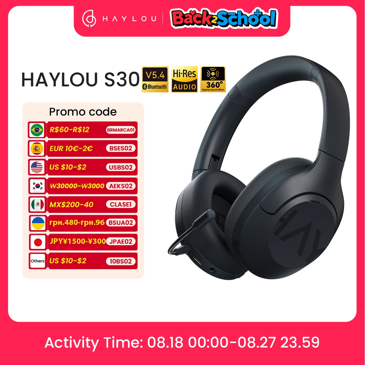 HAYLOU S30 Wireless Bluetooth 5.4 Headphones Detall-Rich Sound 43dB Adaptive Noise Cancelling Headsets 40mm Driver 80H Playtime Earphones Customized APP Handsfree calls -43dB ANC | Bluetooth 5.4 Certified Hi-Res Audio Fast Charging & 80-hour Battery Life 40mm dynamic driver 360° spatial sound effect Dual-device Connection Quick conversation Detachable microphone(*The Standard version and Pro version comes with an e-sports mic) Skin-friendly protein leather earmuffs Smart APP -43dB ANC AI Noise Cancellation. A Brilliantly Quiet WorldWith hybrid ANC technology, the feed-forward and feedback microphones work together to effectively separate background noise of up to 43dB, allowing you to immerse in beautiful music. Bluetooth 5.4 A Smooth Gaming Experience. Bluetooth 5.4 protocol ensures a fast and stable connection with strong anti-interference ability and low power consumption. Stay ahead of the game with low latency of 0.06s. Certified Hi-Res Audio Studio-level Sound Quality. It adopts cutting-edge audio technology and has obtained Hi-Res Audio certification, allowing you to enjoy studio-level sound quality with 24bits/96KHz audio sampling rate. Fast Charging & 80-hour Battery Life 10-minute Charge Provides 5-hour Playtime. Say goodbye to power anxiety with the 600mAh large-capacity battery. Quickly get charged within a short rest. 40mm Large Dynamic Driver Detail-rich Sound. Enjoy Hi-Res Audio via 40mm dynamic drivers that ensure a balanced performance with smooth highs, rich mids, and solid lows. 360° Spatial Sound Effect Immersive Audio Experience. Tap the right earmuff twice to enter bass mode. And enjoy detail-rich sound with the unique low-frequency enhancement algorithm. Bass mode can only be enabled with ANC ON. Dual-device Connection Freely Switch Between Study and Life. The headphones can connect to two Bluetooth devices at the same time, bringing a portable and intelligent interaction experience. Quick Conversation No Need to Take off Headphones Touch the sensing area to weaken music and filter in the ambient sound. Communicate easily while wearing headphones. Music will automatically resume after ending conversation. Skin-friendly Protein Leather Earmuffs Foldable, Comfortable and Pressure-free. The super soft earmuffs can effectively reduce the pressure brought by the glass frames, comfortable to wear for long periods of time. Wired & Wireless Modes AI Call Noise Cancellation. Detachable Microphone. With a e-sports detachable mic and a 3.5mm AUX audio cable , it can accurately pick up sound and clearly restore even weak sound. And AI noise cancellation ensures clear calls in wired and wireless modes. Three Noise Cancellation Modes Outdoor mode|Deep noise cancellation. Playing, waiting, shopping, etc. Comfortable mode|Balanced noise cancellationBus, subway, airplane, etc. Ambient mode|Light noise cancellation. Offices, learning, libraries, etc. Customized App Create Your Own Music World. A variety of personalized functions can be customized in the APP, including noise cancellation depth, EQ selection, device name, game mode etc.
