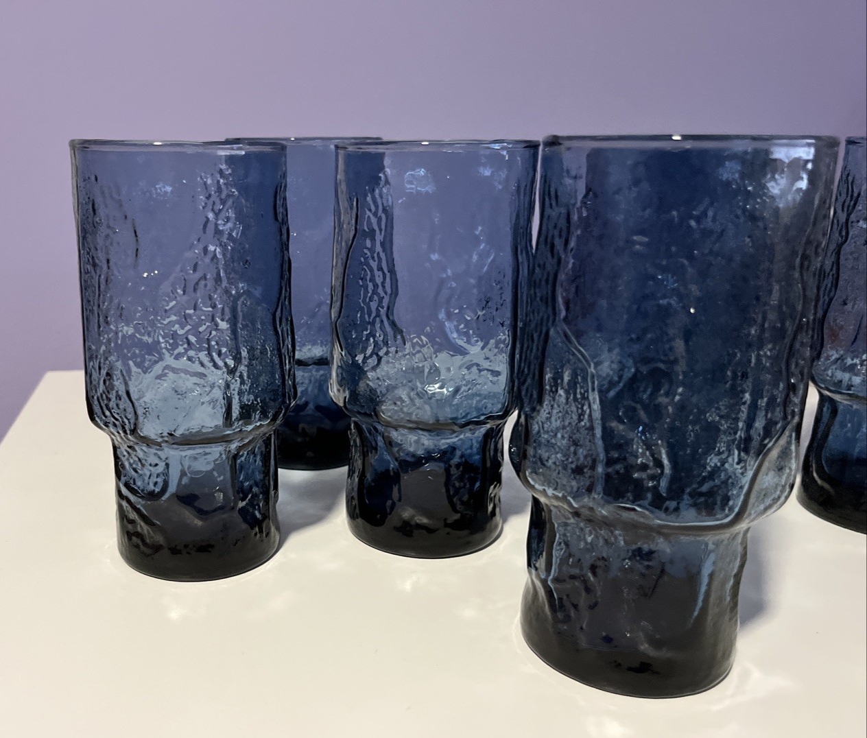 Set of 7 Vintage Libbey Normandy Blue Stone Textured Barware High Ball / Water Glass MCM Circa 1980's - EUC - 6" Tall, 2 3/4" Top Diameter This nice set comes from a local vintage estate and is in Excellent Vintage Used Condition. They would make a nice addition to your set or to match your blue motif. I will be posting 2 other sizes of matching glasses soon as well, in similar condition. Please review all pictures carefully as they are part of the description. Questions are welcome.