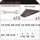 SAE Combination Wrench Set with EVA Storage Tray (15-Piece) 15 SAE combination wrenches in EVA storage tray EVA tray perfect for storing in your tool chest, garage, or shop Forged from Chrome Alloy Steel This 15-piece EVA foam storage tray comes ready to go with combination wrenches and is a great solution for garage organization needs. Sizes are clearly marked for quick identification so nothing will slow you down. Fit this tray inside your toolbox drawer or anywhere in your shop for structured storage wherever you need it. Pack with these included Husky Combo Wrenches: 1/4 in., 5/16 in., 3/8 in., 7/16 in., 1/2 in., 9/16 in., 5/8 in., 11/16 in., 3/4 in., 7/8 in., 15/16 in., 1 in., 1-1/16 in., 1-1/8 in., 1-1/4 in. Features: No Additional Features,Open-End Hand Tool Type: Multi-tool Individual/Set: Set Number of Pieces: 15 Returnable: 90-Day SAE vs. Metric: Metric,SAE Tools Product Type: Hand Tool Manufacturer Warranty: Lifetime Warranty with no questions, no receipt required