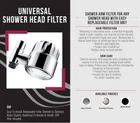 Showering in chlorinated water, a frequently found in water supplies, can strip the oil from the hair causing it to become fragile and crack and causing skin to dry and crack, leading to permanent signs of aging. Showering with filtered water helps prevent these damaging effects. The in-line shower head filter provides you with a healthier and refreshing shower experience. The triple action filtration cartridge removes impurities, heavy metals such as lead, mercury, organic chemicals like hydrogen sulfide and chlorine and other harmful substances from your water while enhancing the water's cleansing abilities by releasing beneficial natural minerals that the human body needs. Maintains a 1.8 GPM flow rate. Filter cartridges should be replaced every six (6) months or 10,000 gallons and are sold as -packs. HHF filter unit is with models: SCH900F, F730, HSF731 and HSF6701. SHF filter unit is with models: SCH900F, SHF5700 and SAF. VISIT OUR STOREFRONT for more Kitchen and Bath items to stylize your home with convenient functionality and beauty. PREVENT DAMAGED HAIR AND SKIN: Prevent damaging effect caused by harmful substances in your water that strip natural oils from hair and sking causing them to become dry, fragile and crack leading to permanent signs of damage EASY INSTALL: Designed to attach to most standard US 1/2-inch 14NPSM pipe threads for use with fixed wall mount and ceiling shower heads THREE-LAYER FILTRATION SYSTEM: LAYER : PP Cotton filter removes micro mud, rust and impurities with a diameter larger than 5 microns, LAYER : Activated carbon filter reduces scale build-up, removes chlorine, heavy metals and organic substances, LAYER THREE: stone filter removes chlorine and impurities, organic matter and miscellaneous bacteria and releases natural minerals that the human body needs QUICK FILTER : Just swap the old cartridge with a new , flush with hot water for (1) minute, and it’s ready for use FOR BEST RESULTS: Replace filter cartridge every six (6) months, 10,000 gallons or if it begins to discolor