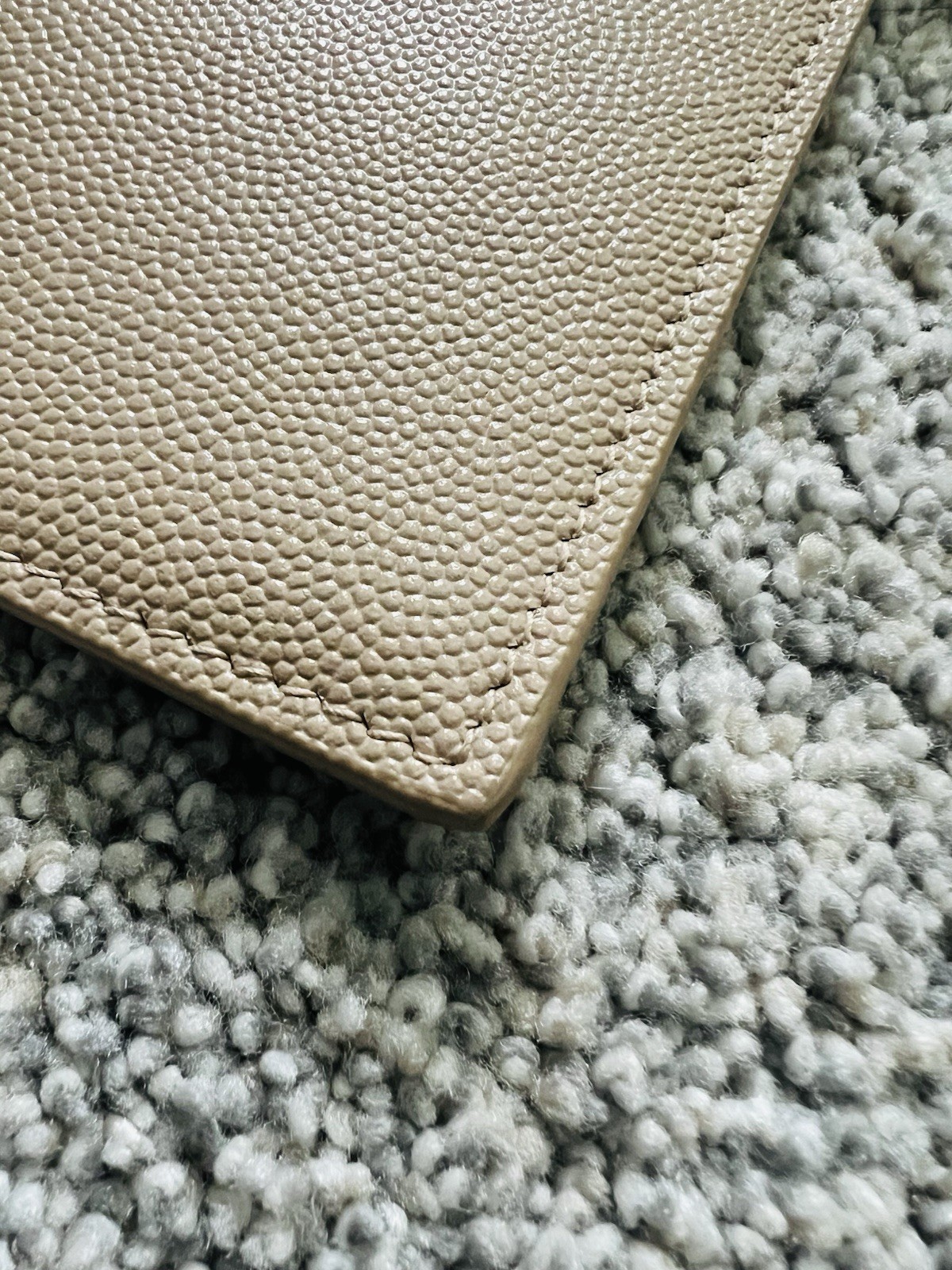 Condition: Like New/Pristine Call-Out(s): None SAINT LAURENT Grain De Poudre Uptown Pouch in Dark Beige. This clutch is crafted of beige-grained calfskin leather and features a facing V-shaped flap with a gold YSL logo. The flap opens to a black fabric interior.