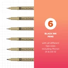 When accuracy, performance and preservation count, the unparalleled fine nibs and archival ink quality of the Sakura Pigma Micron fineliner pens are the go-to tool for art, work, and play. Experience smooth writing and crisp ink quality that delivers precise points and lines. Features archival Pigma ink that doesn’t bleed through most papers, is quick drying, waterproof and fade resistant. Pigma ink, invented by Sakura over 30 years ago, continues to be the most reliable permanent ink on the market today. Artists, consumers, the government, and scientists consider Pigma Micron a necessary basic tool for any archival-quality, handwritten project. This permanent, pigment-based ink will not bleed or run if liquids are spilled on or applied to the document after the ink has dried. Perfect for legal situations, Pigma ink is nearly impossible to alter on documents, in log books, or on checks. Architects, archivists, anthropologists, entomologists and laboratories depend on Pigma Micron for record keeping. Manga artists, professional illustrators and watercolorists use the range of point sizes to create precision lines. Scrapbookers and crafters value its archival quality for preserving memories in journals, and notebooks. Use Pigma Micron to leave a mark that will last a lifetime. Certified non-toxic, approved by ACMI toxicologists & bears trusted AP Seal. Not evaluated for cosmetic use on skin. Not recommended for use on fabrics intended to be washed. Set includes 1 each of 6 points sizes in black ink: Micron 01 - 0.25 mm, Micron 03 - 0.35mm, Micron 05 - 0.45mm, Micron 08 – 0.5mm, Micron 10 – 0.6mm and Micron 12 - 0.70mm fineline pens. Precise Ink: Black ink creates precise marks that stand the test of time. Assorted Sizes: Contains 1 of each Micron pen: 01, 02, 05, 08, 10, and 12. Fade Resistant Ink: Sakura Micron Pen ink is waterproof, fade resistant, bleed free, quick drying, and pH neutral. Color Consistent: Pigma Micron pens use color from single pigments for color consistency, every time. Professional Quality: Japanese quality Sakura pens deliver professional results.