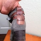 Sam Edelman women's Hannah grayish tan in color with brown wrap strap and buckle. CONDITIONS pre owned, minor wear, good conditions. see photos for more details.