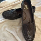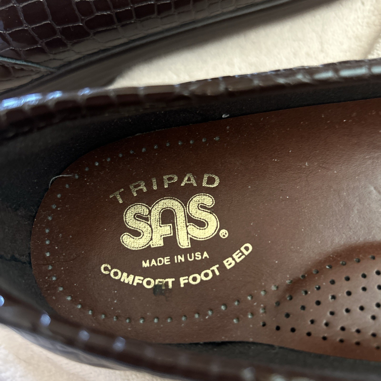 The SAS Brown Tripod Moc Croc Slip-on Leather Comfort Loafers for women are a stylish and comfortable option for everyday wear. Featuring a slip-on design, patent leather upper, and a comfortable footbed, these loafers provide both convenience and a sleek appearance. The brown color and classic loafer style make them versatile for various outfits and occasions, while the sturdy tripod construction adds durability to the shoe. Whether for work or casual outings, these loafers by SAS are a practical and fashionable choice for any woman's wardrobe. Excellent condition!
