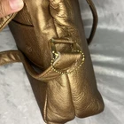 This SAS leather metallic bronze shoulder handbag is a stylish and versatile accessory for any occasion. Handmade in the USA, this medium-sized bag features a rectangular shape with a zip closure and gold hardware accents. The adjustable shoulder strap allows for comfortable wear, while the bronze metallic finish adds a touch of glamour. Perfect for travel, weddings, parties, casual outings, formal events, or workwear, this unique bag is a must-have for any fashion-forward woman looking to make a statement. Condition: normal wear and tear.